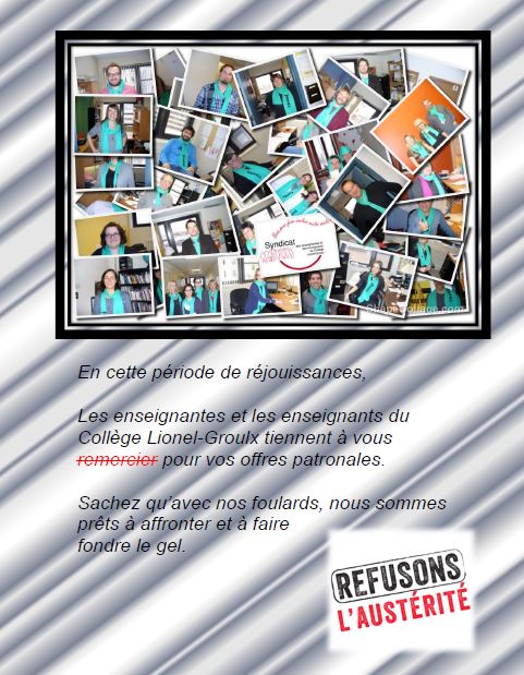 - 19 décembre : Dîner de Noël du Collège – une touche de vert pour les services publics! (invitation à porter le foulard FNEEQ)