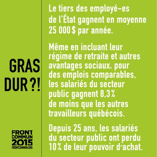 Difficile semaine pour l’ensemble des travailleurs et des travailleuses de la santé et de l’éducation, dure semaine pour les services publics, sombre semaine pour le Québec. Alors que les secteurs de la santé et de l’éducation, piliers de la cohésion sociale de toute nation qui se respecte, devraient être des priorités, c’est à la déchiqueteuse que le gouvernement Couillard s’apprête à balancer les conventions collectives de ceux et celles qui offrent ces services. Si les offres patronales étaient adoptées telles quelles, les résultats seraient désastreux : départs massifs à la retraite, alourdissement de la tâche pour tout le monde, perte de pouvoir d’achat, augmentation arbitraire du pouvoir discrétionnaire des gestionnaires, mécanismes de contrôle sévères, remise en question de la reconnaissance syndicale, etc. Couillard, Coiteux et consorts n’ont qu’une phrase à la bouche : souplesse et efficience nécessaires en contexte budgétaire difficile. Alors que nous revendiquons des meilleures conditions de travail pour assurer la pérennité de services publics de qualité à la population, le gouvernement Couillard fait tout le contraire en s’attaquant à nos conditions de travail. L’intention est claire : finir cet ouvrage de destruction afin de dégager et de justifier toutes les marges de manœuvre qui permettront la privatisation du Québec.
