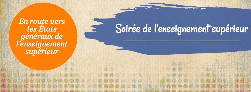 - 19 mars (18 h, Bain Mathieu, 2915, rue Ontario Est, Montréal) : Soirée de l’enseignement supérieur dans le cadre des États généraux sur l’enseignement supérieur à venir (entrée libre, léger goûter servi : confirmez votre présence à cette soirée le plus tôt possible par courriel à l’adresse seeclg@clg.qc.ca).