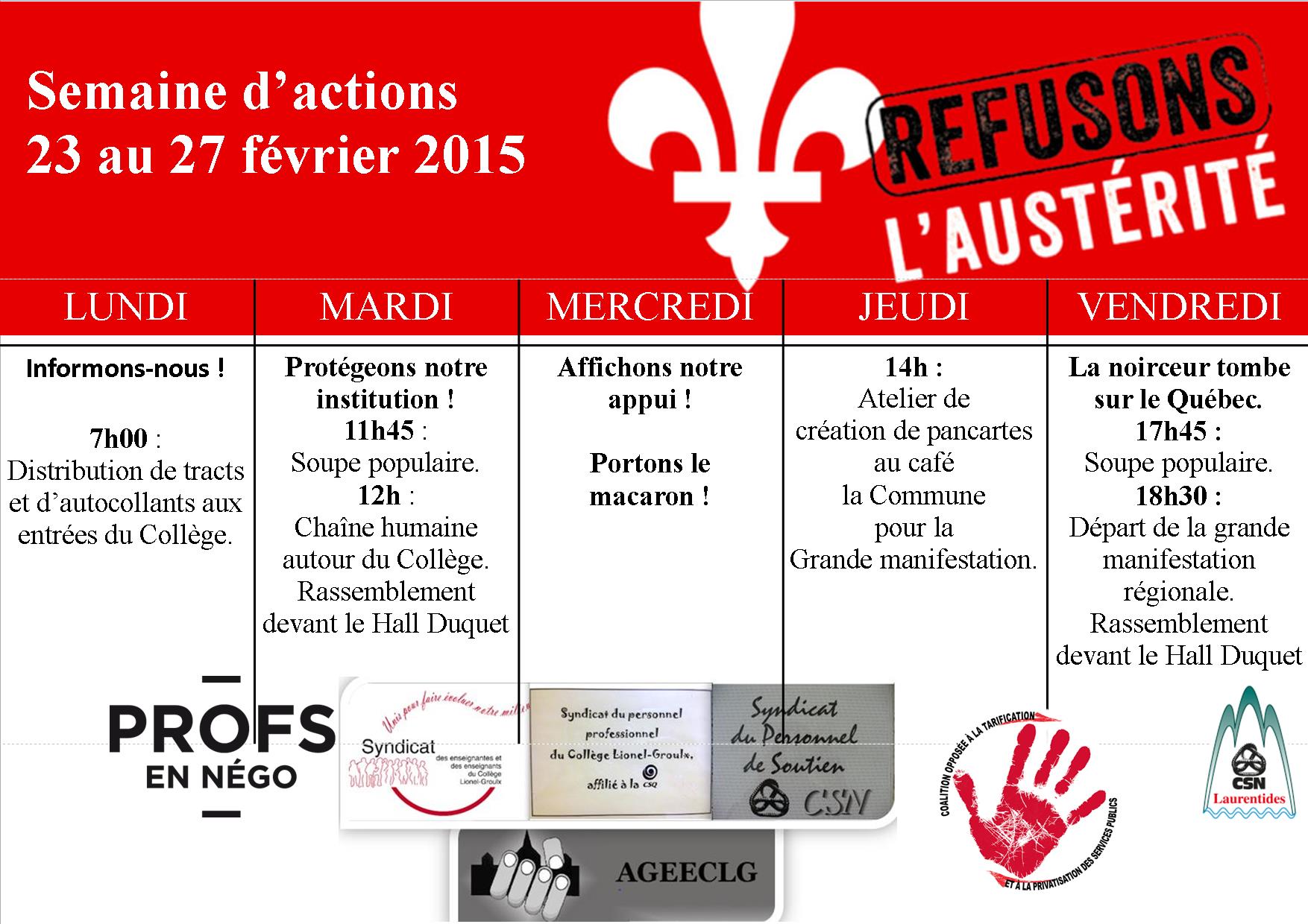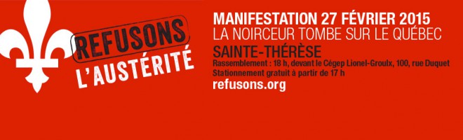 - 27 février : Grande manifestation régionale contre l’austérité – «La noirceur tombe sur le Québec» – 17 h 45 : soupe populaire; 18 h 30 : départ de la grande manifestation régionale (rassemblement devant le hall de l’entrée Duquet).