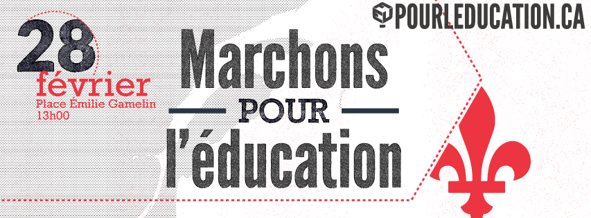 - 28 février (13 h, Place Émilie-Gamelin, Montréal, métro Berri-UQÀM) : Manif «Marchons pour l’éducation» – La FEUQ invite toute la population à une grande marche le 28 février prochain au parc Émilie-Gamelin. Rejoignez-nous avec votre famille et vos amis à 13 h afin de démontrer l’importance de notre réseau d’éducation : « Des CPE à l’université, marchons pour l’éducation ! »