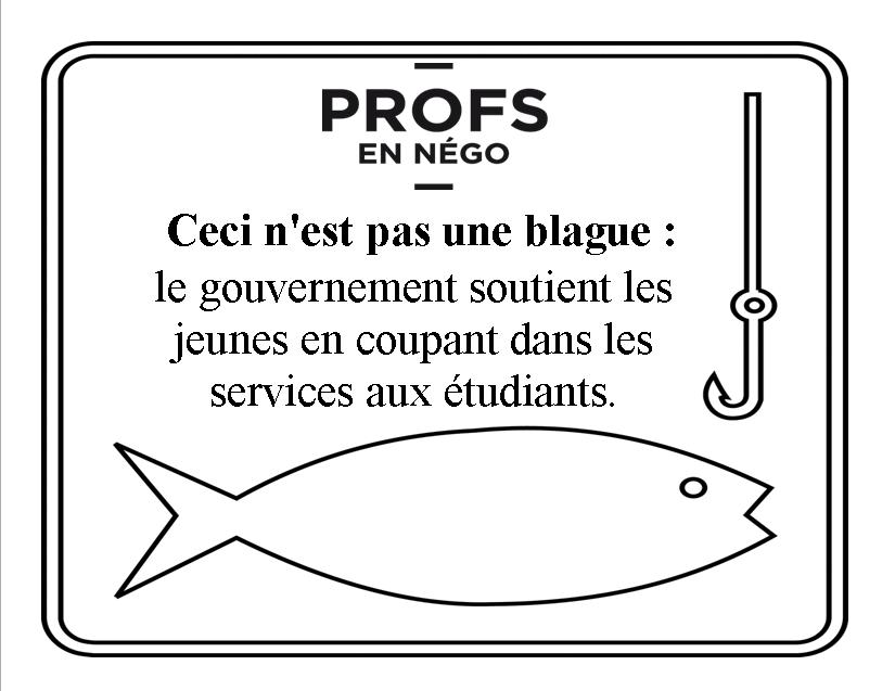 RAPPEL ACTION «POISSON D’AVRIL» (dans le cadre d’une action nationale) : Pour souligner notre premier jour de travail sans contrat, nous vous invitons, le 1er avril, à mutuellement, entre collègues, vous garnir de tracts «Poisson d’avril» (voir un des tracts ci-dessous). Soyons fiers d’afficher nos revendications pour une plus grande reconnaissance de notre profession! (Vous trouverez un tract et un petit collant dans votre casier de prof.)