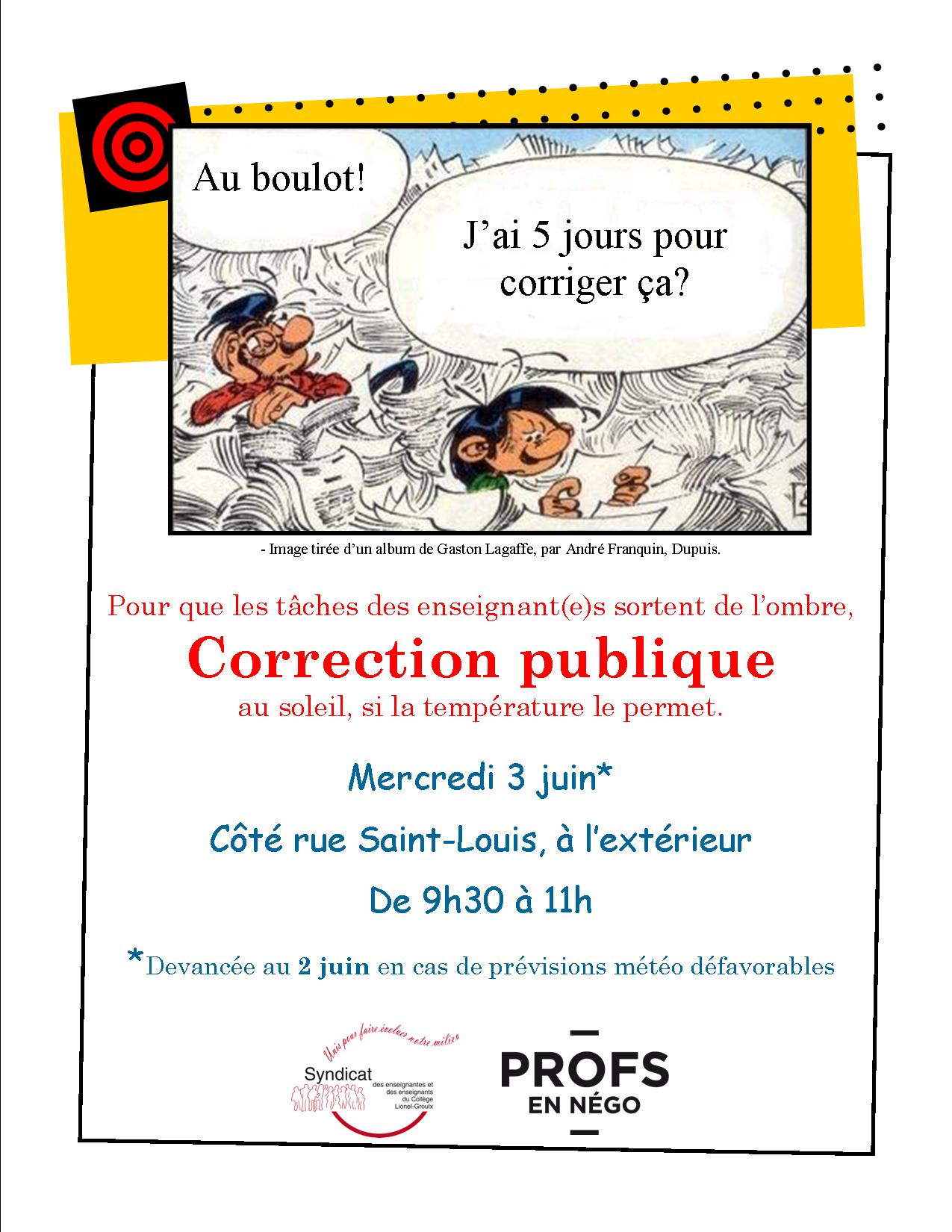 - 3 juin (9 h 30 à 11 h) : Action «Correction publique»! Pour nous assurer d’un minimum de participants (60), cliquez ici pour vous inscrire. (Activité devancée au 2 juin si prévisions météo défavorables pour le 3 juin.) Portez votre foulard FNEEQ et votre macaron «Profs en négo»!