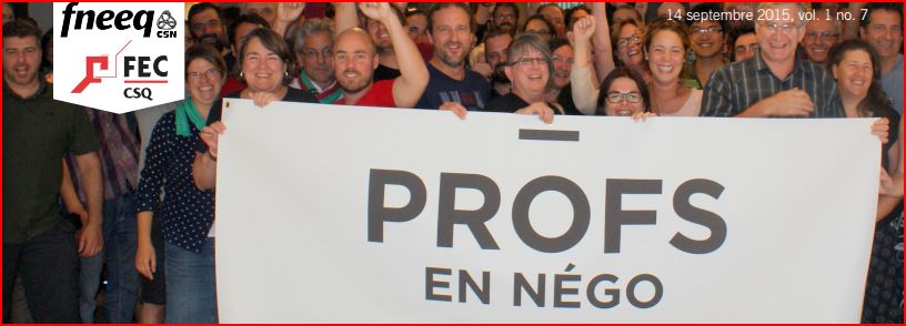 Vous savez sans doute que tous les syndicats du Front commun sont actuellement en consultation de leurs membres pour un mandat de «6 jours de grève à exercer en Front commun sur une base rotative et régionale ou nationale, et ce, en tenant compte de la conjoncture de la négociation». Quelques cégeps ont déjà tenu leur vote et, si la tendance se maintient, le Front commun se dirige vers un mandat très fort (voir la rubrique ci-dessous). Se donner un mandat de grève consiste, en soi, en un moyen de pression très significatif politiquement. C’est pourquoi il est essentiel que nous soyons nombreuses et nombreux à l’assemblée générale du 23 septembre afin de décider ensemble du rôle que nous voulons jouer. Afin de faciliter la logistique de cette rencontre, nous vous invitons, si ce n’est pas déjà fait, à consulter les demandes de négo de la partie patronale. Lors de l’AG du 23 septembre, un plan d’action sera aussi présenté. Ce plan d’action découlera des discussions qui auront eu lieu au sein du comité de mobilisation élargi (avec coordonnateurs et délégués, jeudi dernier) ainsi que du conseil syndical (réunion des délégués syndicaux qui aura lieu demain, mercredi 16 septembre). Pour plus d’information, interpellez votre délégué, votre coordonnateur ou passez nous voir au F-202.