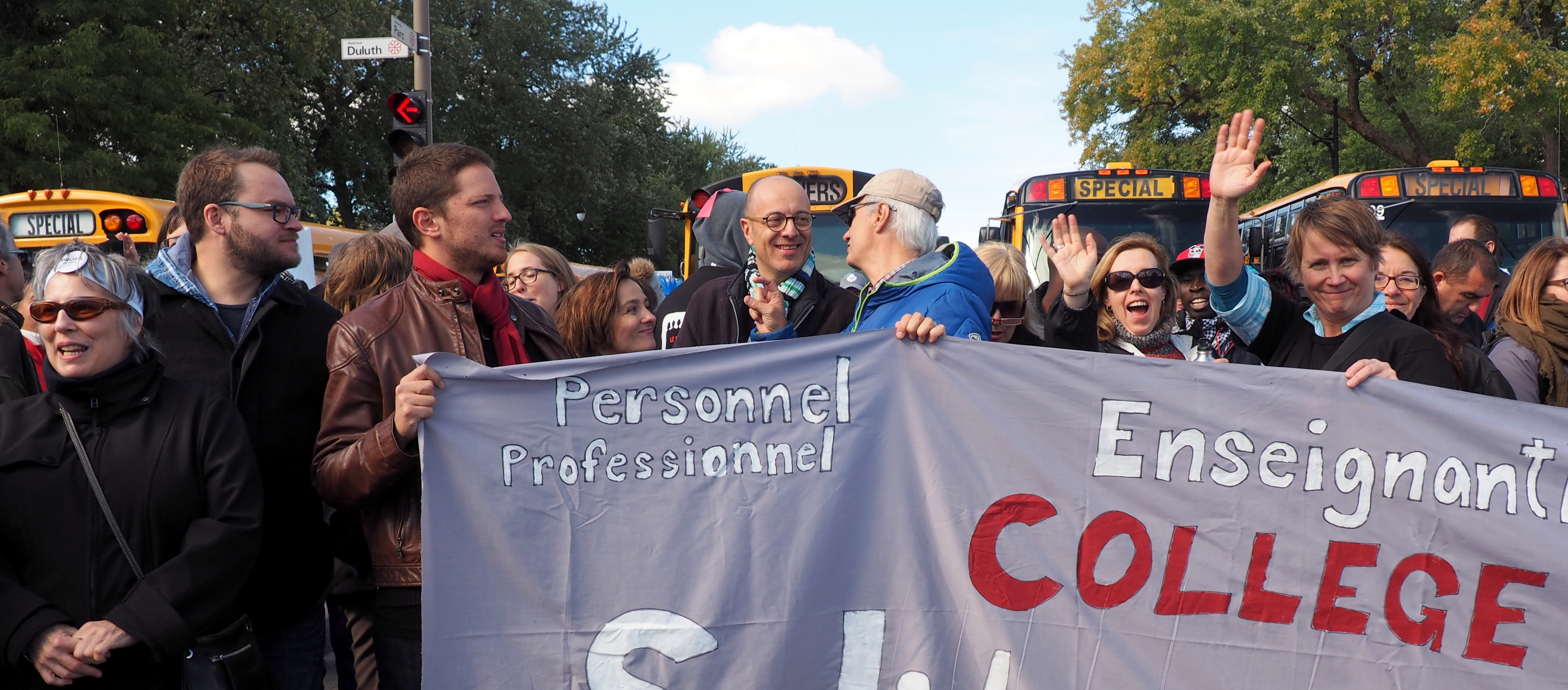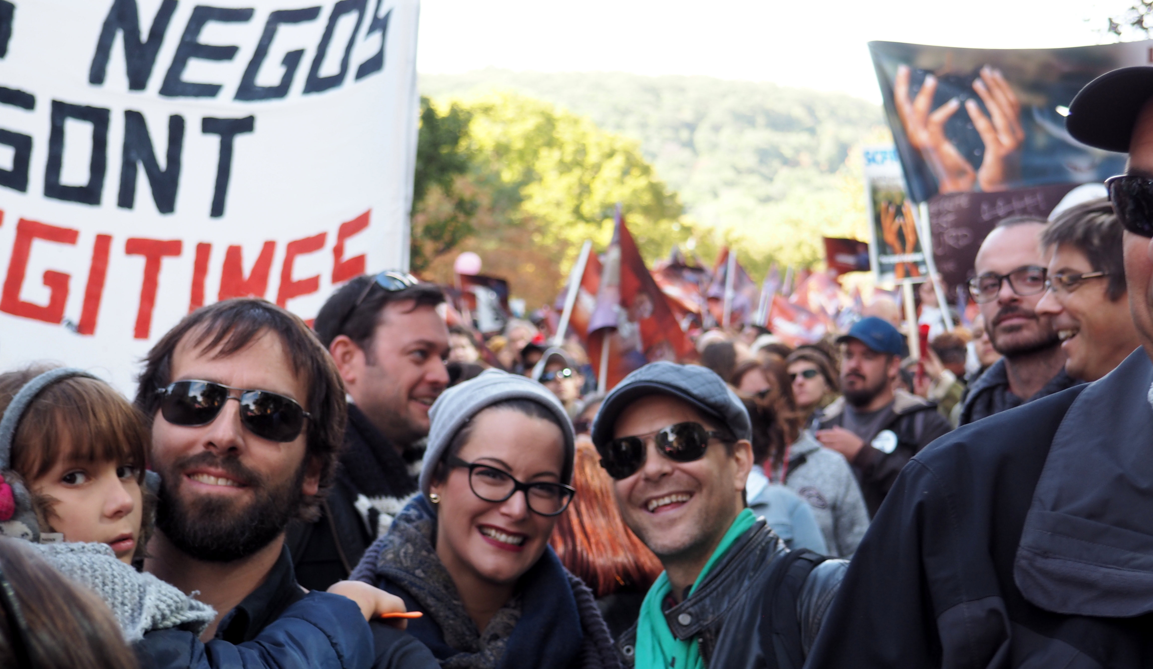 - Samedi 3 octobre : C’est plus de 100 profs de Lionel-Groulx qui sont allés défendre l’éducation samedi dernier à la manifestation «Avec nous dans la rue!»! Plusieurs étaient accompagnés de leur famille et amis. Avec, en plus, de nombreux membres du soutien et des professionnels, on était une super belle GROSSE «gang» de Lionel! Respect!