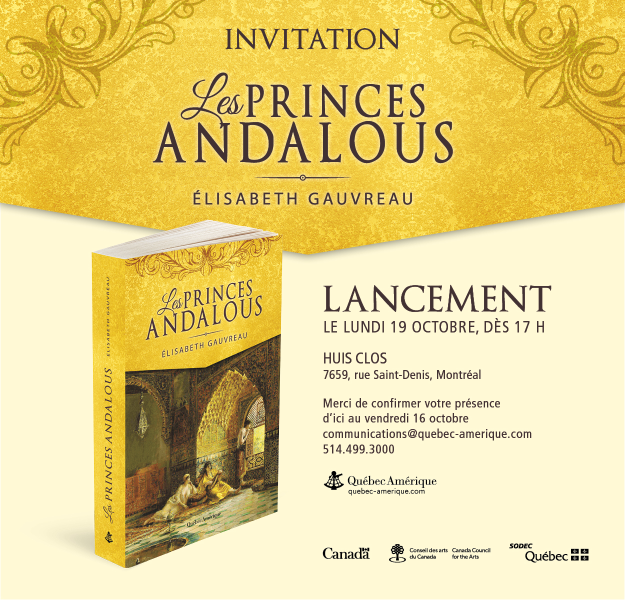 - LUNDI 19 OCTOBRE, dès 17 h, au Huis clos (7659, St-Denis, Montréal) : Lancement du roman Les princes andalous de Élisabeth Gauvreau, professeure au département de français. Toutes nos félicitations!
