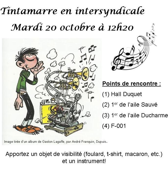- 20 octobre : Action «Tintamarre» – Rendez-vous à l’un des quatre points de rencontre (voir affiche ci-dessous) à 12 h 20. Soyons sonores!