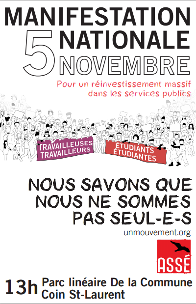 - 5 novembre : Manifestation «Pour un réinvestissement massif dans les services publics» (13 h, Parc linéaire de la Commune, coin St-Laurent, Montréal; organisée par l’ASSÉ).
