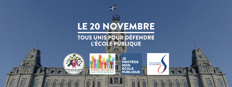 - 20 novembre : Grande manifestation «Tous unis pour défendre l’école publique» – «Le 20 novembre, les parents des quatre coins du Québec s’uniront pour défendre l’école publique au cours d’une grande mobilisation à Québec. Ce front commun est composé du mouvement Je protège mon école publique (JPMEP), de la Coalition des parents pour l’école publique (CPEP) et de la Coalition des parents d’enfants à besoins particuliers (CPEBP), laquelle travaille en collaboration avec le groupe Plus de services au Québec pour nos enfants différents.»