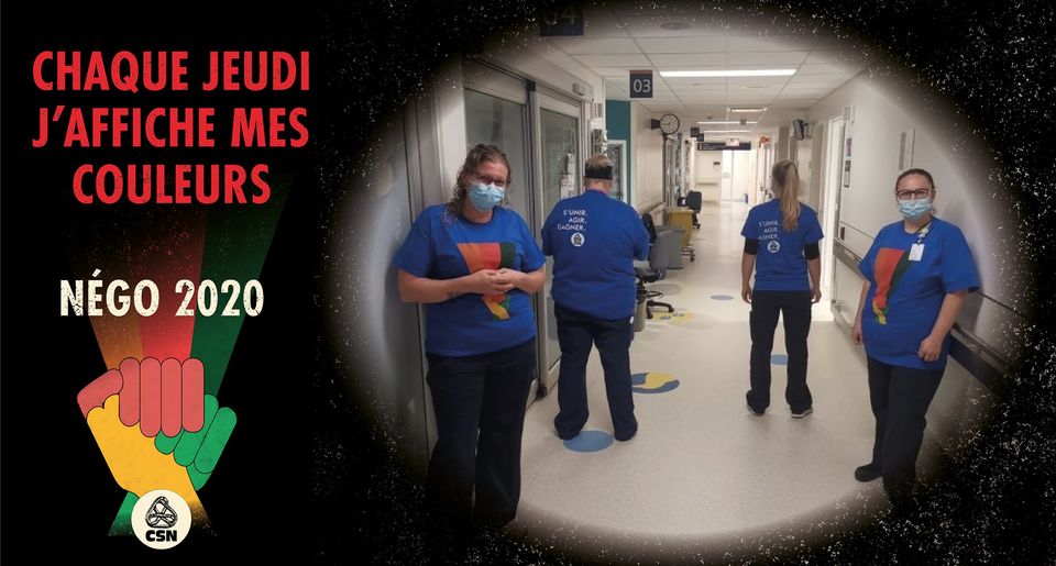 «Dès aujourd’hui, et ce tous les jeudis, portons fièrement le chandail de la négo. Montrons au gouvernement que nous soutenons massivement nos revendications pour de meilleurs salaires et de meilleures conditions de travail.Nous vous invitons à vous prendre en photo ![]()