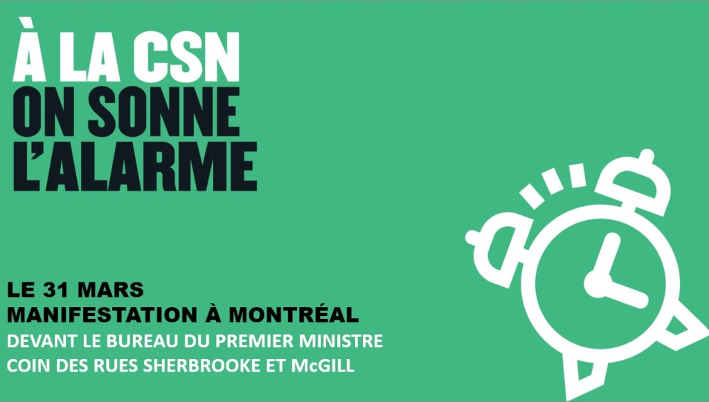 31 mars : Un an sans convention. Tintamarre CSN (Soutien et profs) midi à 12h30