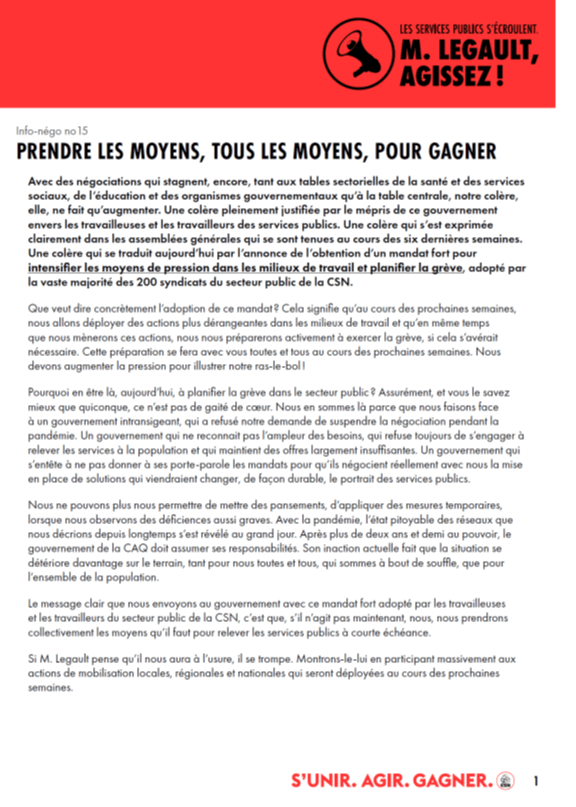 La présidente du Conseil du trésor, Sonia LeBel, vient tout juste de convoquer les organisations syndicales du secteur public (CSN, CSQ, FTQ, FIQ, APTS, FAE) à une rencontre mardi soir prochain, à Québec. Jacques Létourneau, président de la CSN, y sera. Nous vous tiendrons informés des développements.