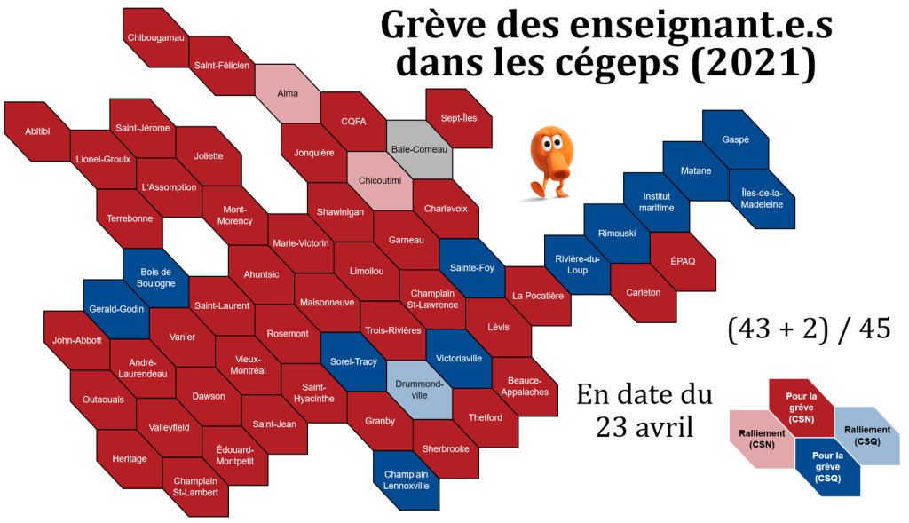 21 avril. 226 membres présents à l’Assemblée. 40 minutes de présentation. 30 minutes de questions-réponses. Merci à Josée Déziel, membre du comité de négociation, pour son aplomb et la clarté de ses propos. À 19h, nous avions les résultats. 184 votants. 131 pour et 53 contre. Le mandat de grève est obtenu à 71%. Si vous regardez bien la carte en une, nous faisons partie de la majorité des cégeps FNEEQ-CSN (en rouge) à avoir donné ce nouvel outil à notre comité de négo. Bien sûr, la grève n’est pas une fin en soi, nous l’avons répété à moult reprises. Elle est un moyen pour augmenter la pression face au gouvernement. L’éducation est prête. Reste à voir comment se comportera la santé.