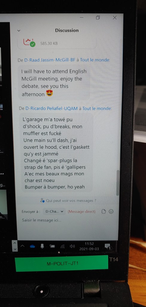 Réfléchir au projet de loi 96, loi sur la langue officielle et commune du Québec, le français, et à son application au collégial. Il y a tant à dire. Toute une journée à travailler la proposition fournie. Avant de recevoir les power points et toute la documentation, je vous soumets deux photos qui révèlent que c’est toujours un sujet sensible en 2021…