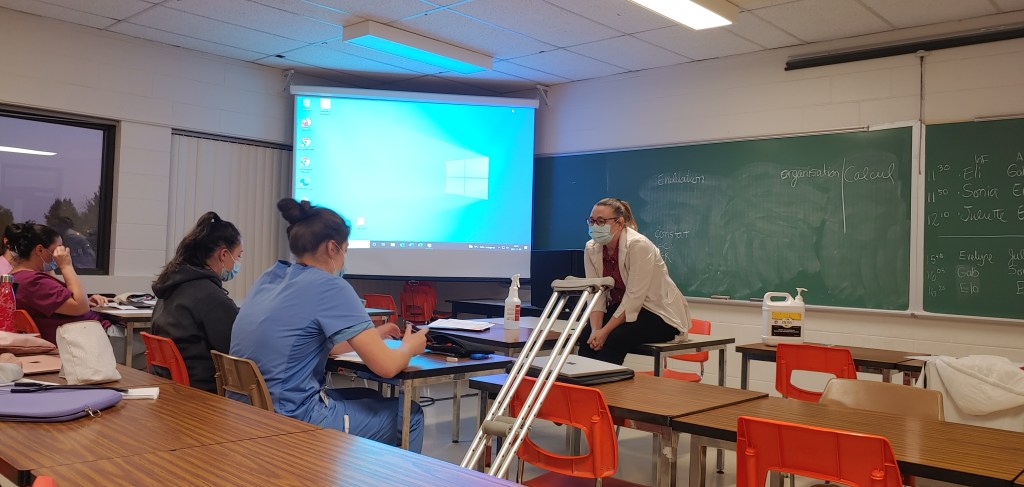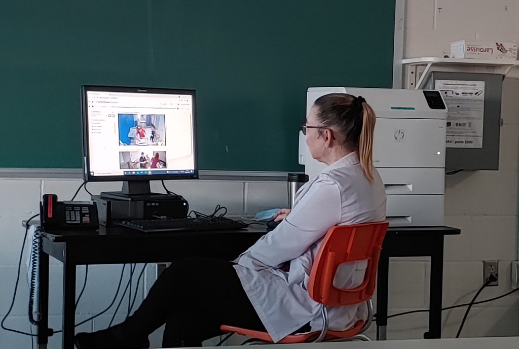 C’est une Isabelle Laporte engagée qui nous a ouvert la porte de sa classe le 8 novembre dernier. Joan et moi avons assisté à 3 simulations vidéo d’une 15 aine de minutes chacune où les étudiantes en soins, en équipe de deux, performent sur ce qu’ils ont appris. Mannequin de bébé (qui pleure au moment où il n’a plus de couverture et au moment de la piqûre) en main, les 6 étudiantes seront, tour à tour, actrices et juges de leurs collègues.