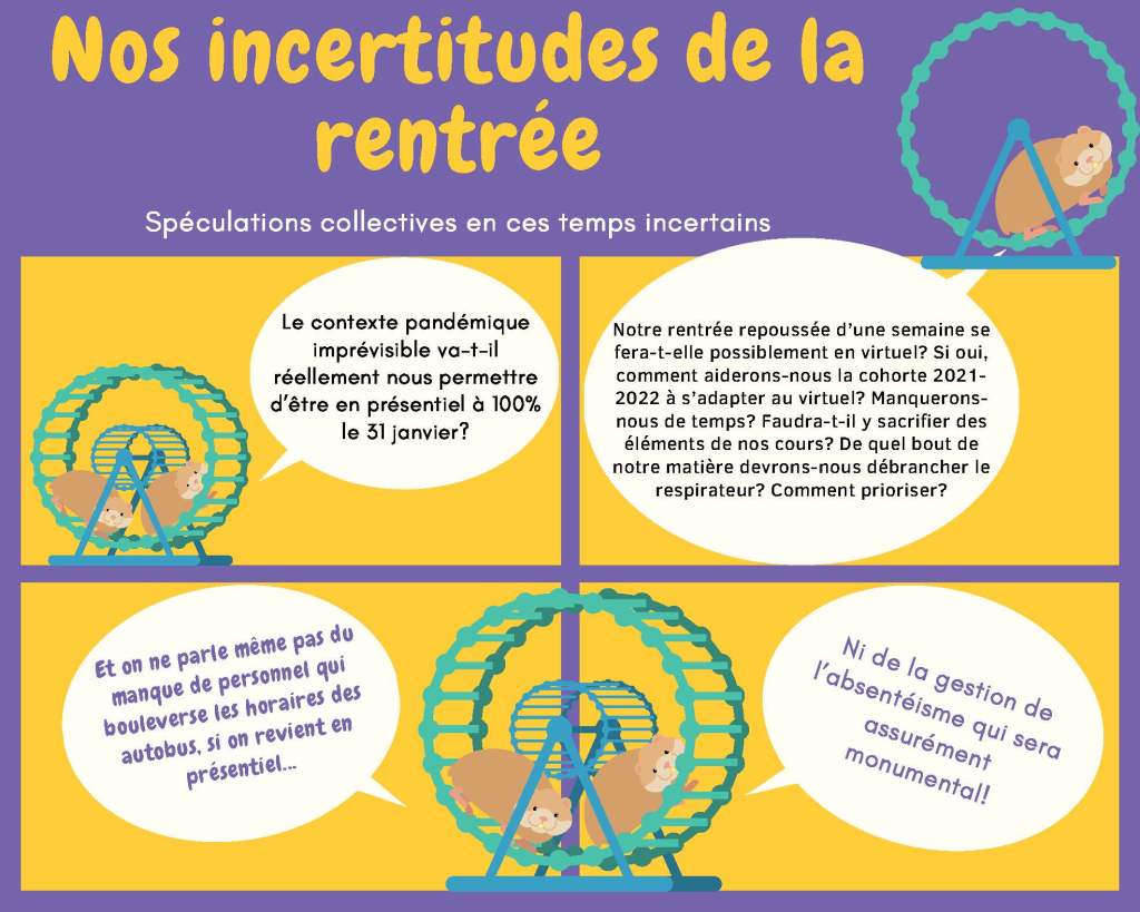 Le 12 janvier 2022, toute la communauté du collège Lionel-Groulx a reçu un avis qui reportait officiellement le début des cours au 31 janvier, en présentiel. Le valeureux hamster de la spéculation collective a alors repris sa course effrénée: