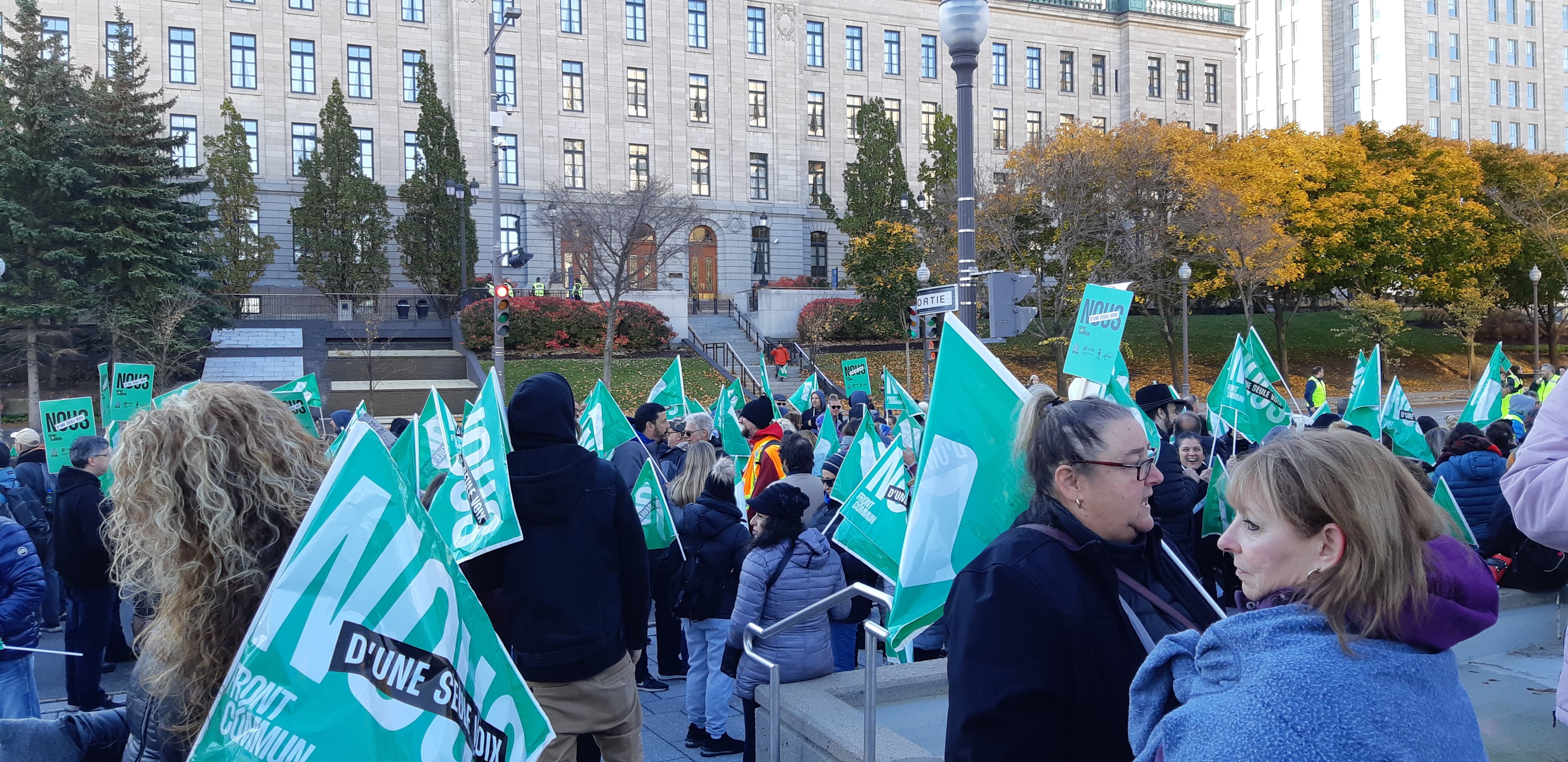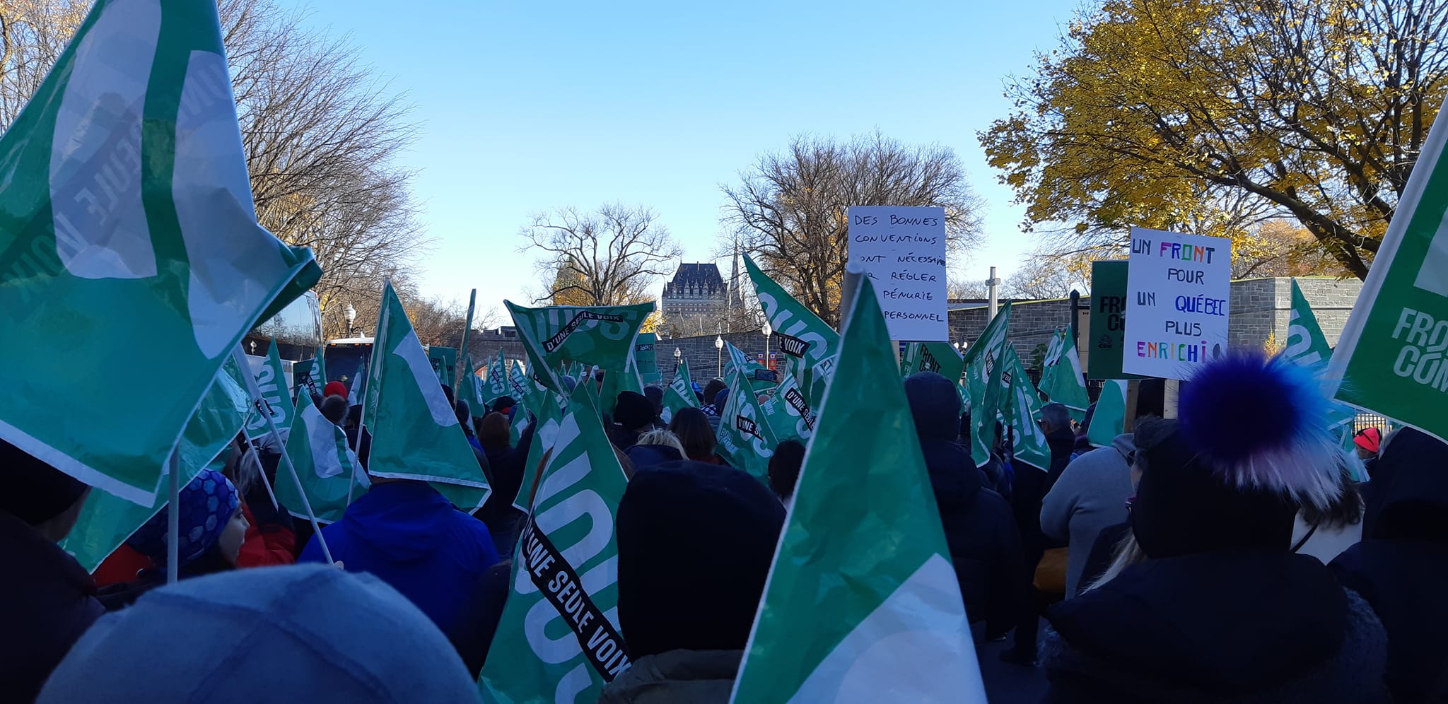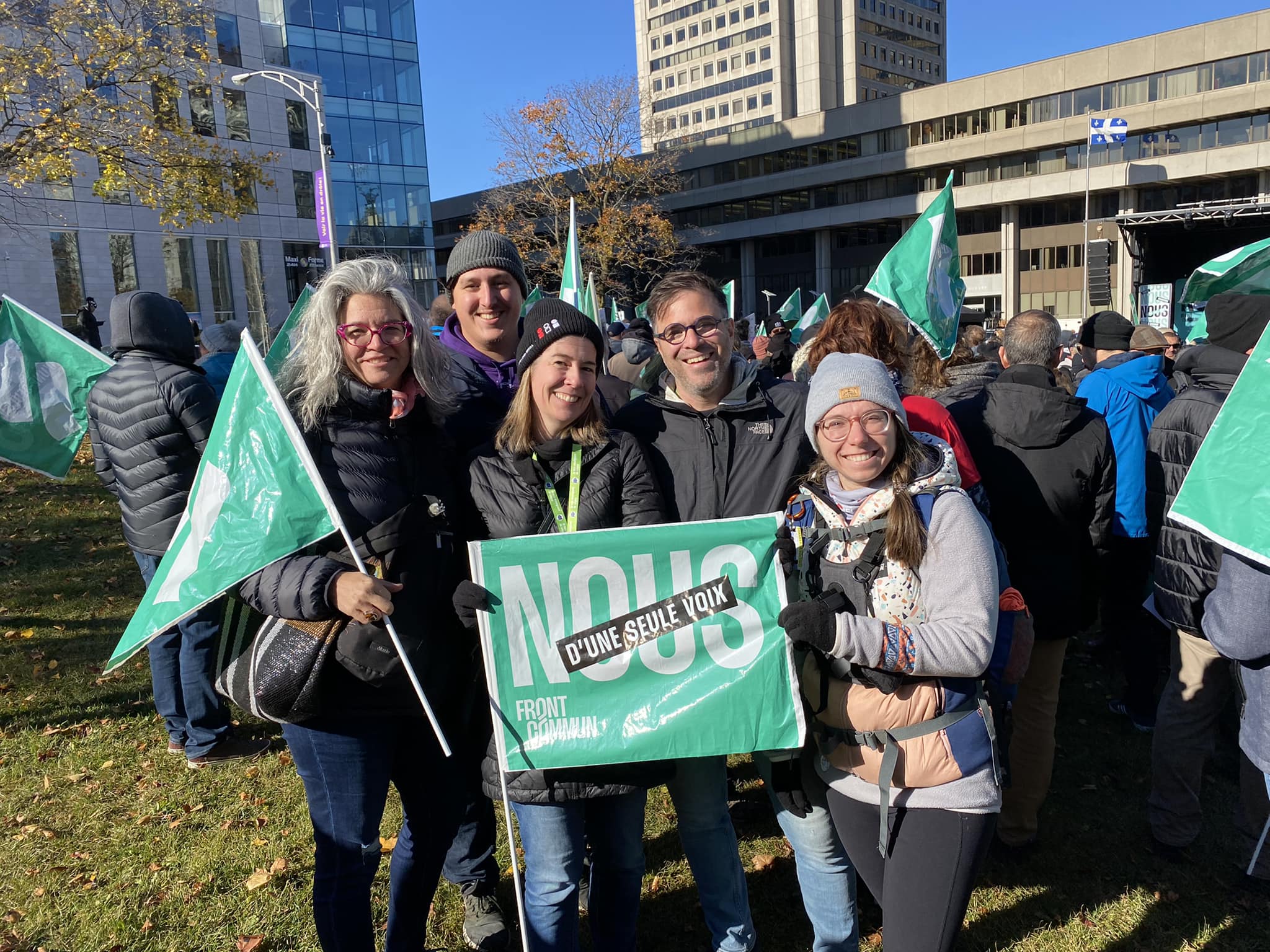 Sur cette photo, les trois syndicats de Lionel-Groulx se retrouvent côte à côte en Front commun. S’unir, dans les bouleversements de la situation d’urgence du 18 novembre dernier, encore plus en négo, encore plus dans le chaos que dessine la croissance de notre collège, encore plus dans les mois gris et froids qui nous attendent… C’est peut-être en partie la solution à adopter… Bonne lecture!