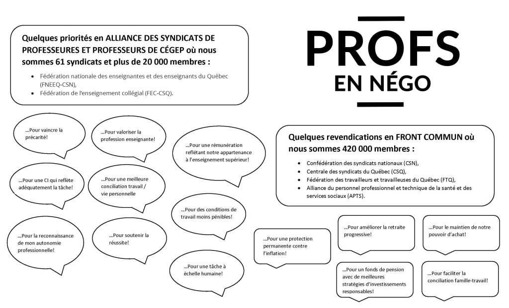Ce n’est pas toujours simple de suivre ce qui se passe avec nos négociations entre nos piles de copies à corriger, nos réunions et nos cours. C’est pour cela qu’on a résumé ici quelques-unes des priorités pour lesquelles nous nous mobiliserons cette année. Dans les prochains jours, vous les membres du comité de mobilisation vont travailler fort pour qu’ensemble on discute davantage de tout cela: