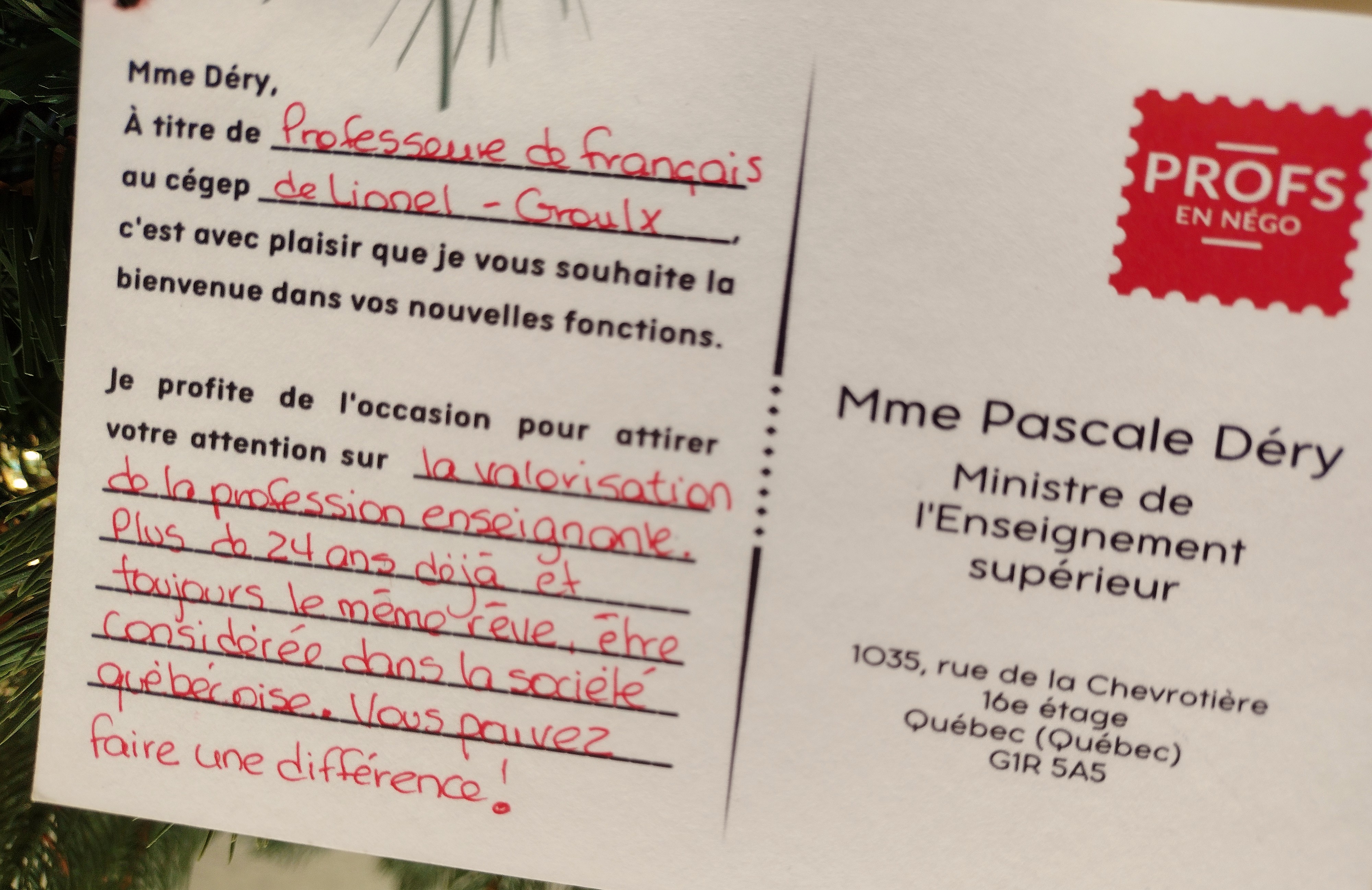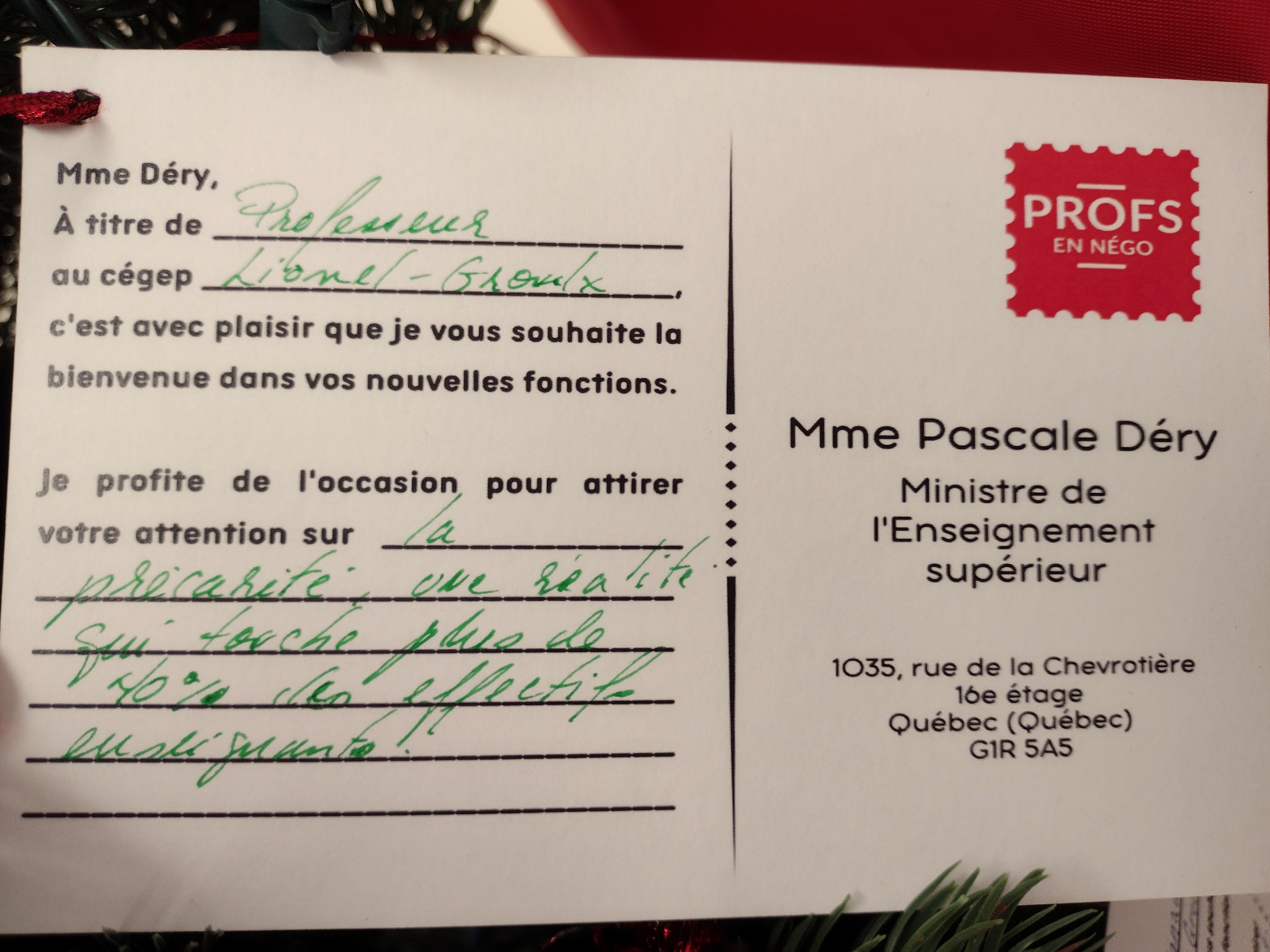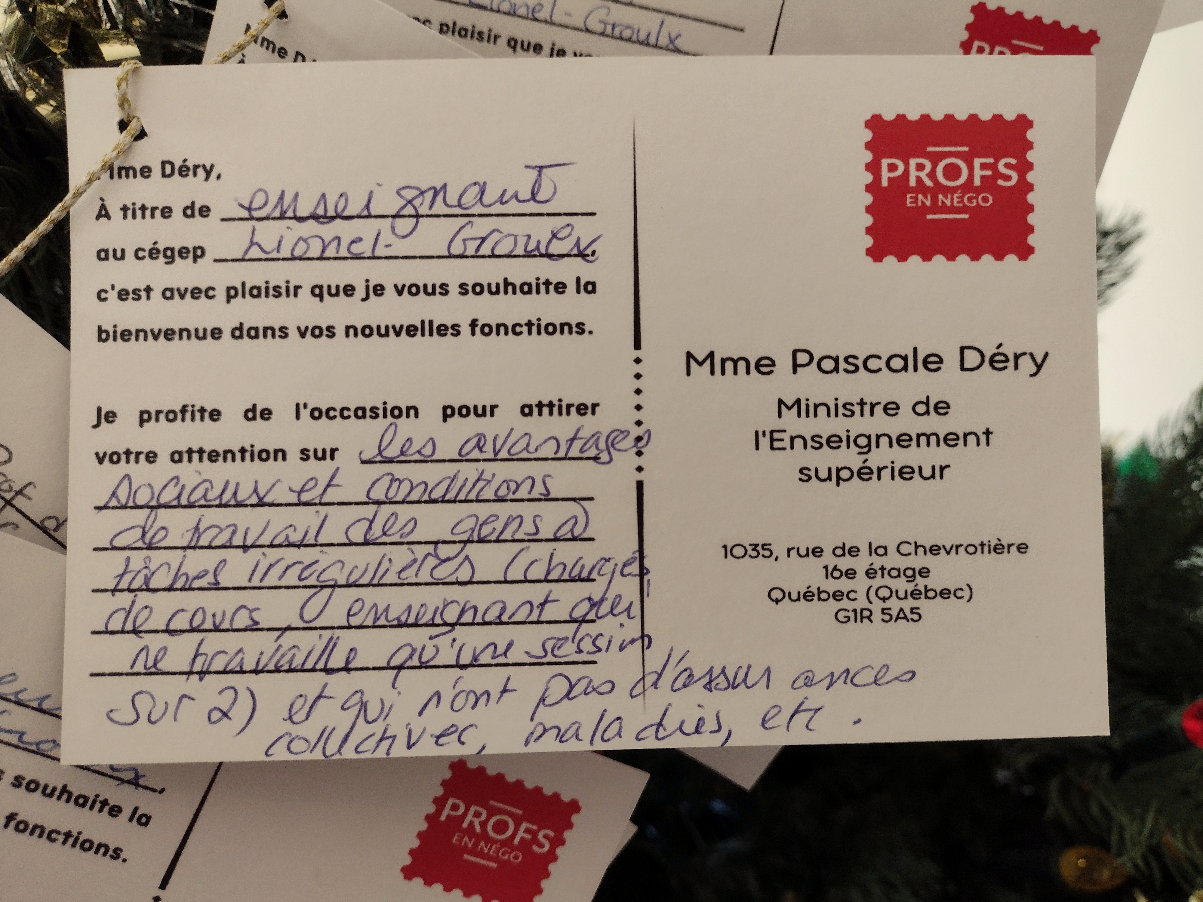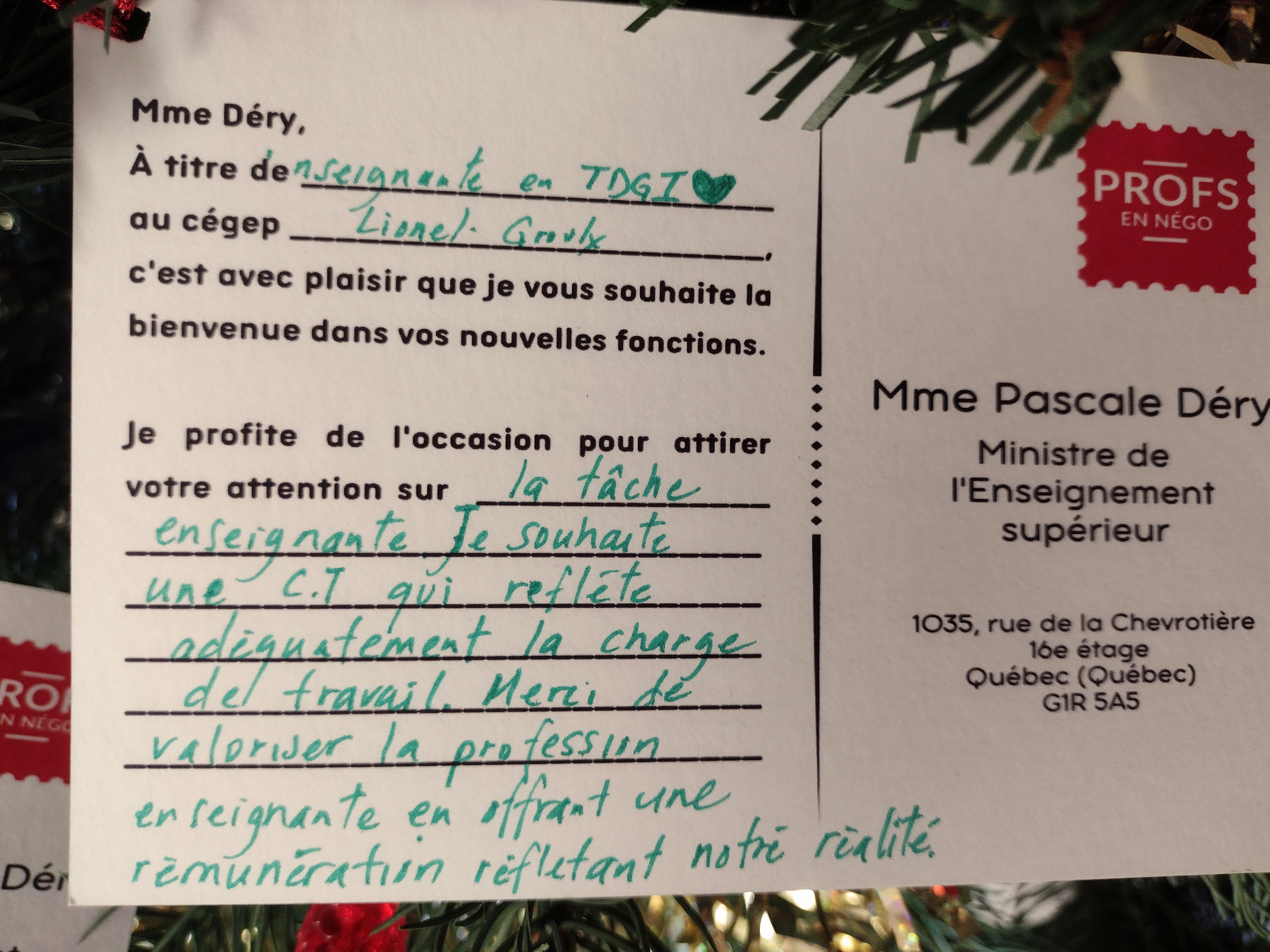 Sapin syndical ambulant, décoré de nos cartes postales à la nouvelle Ministre: les souhaits des profs adressés à notre Mère-Noël Pascale Déry