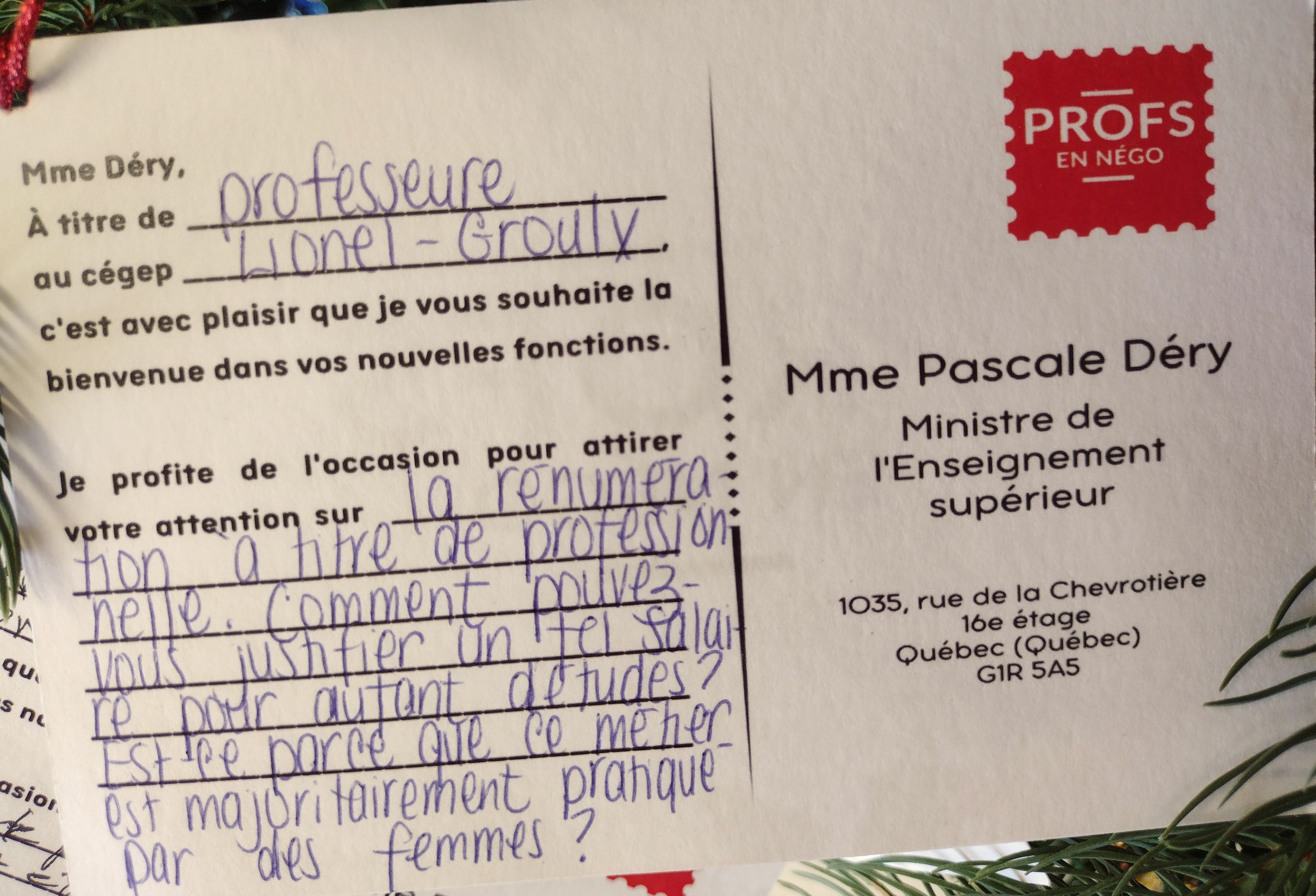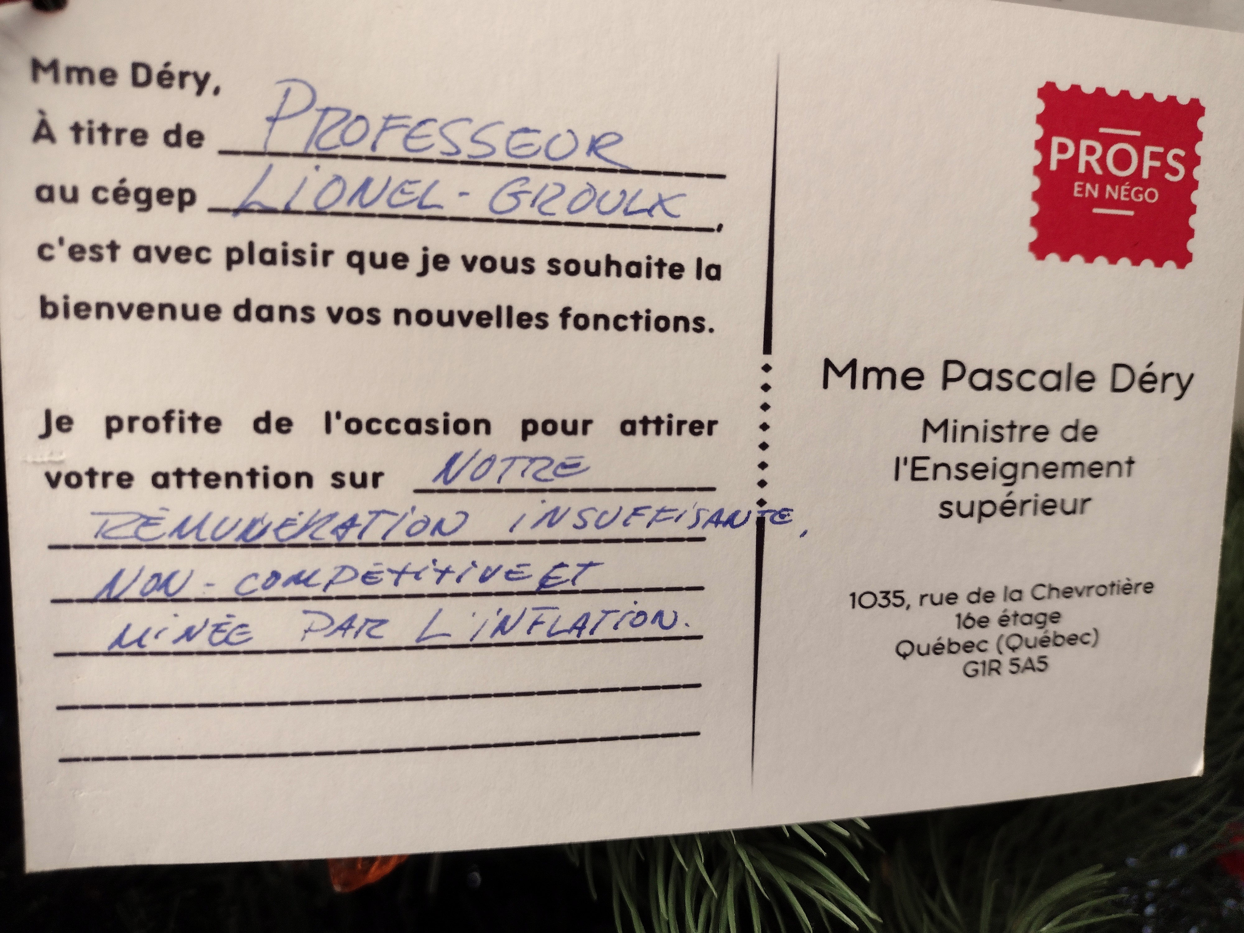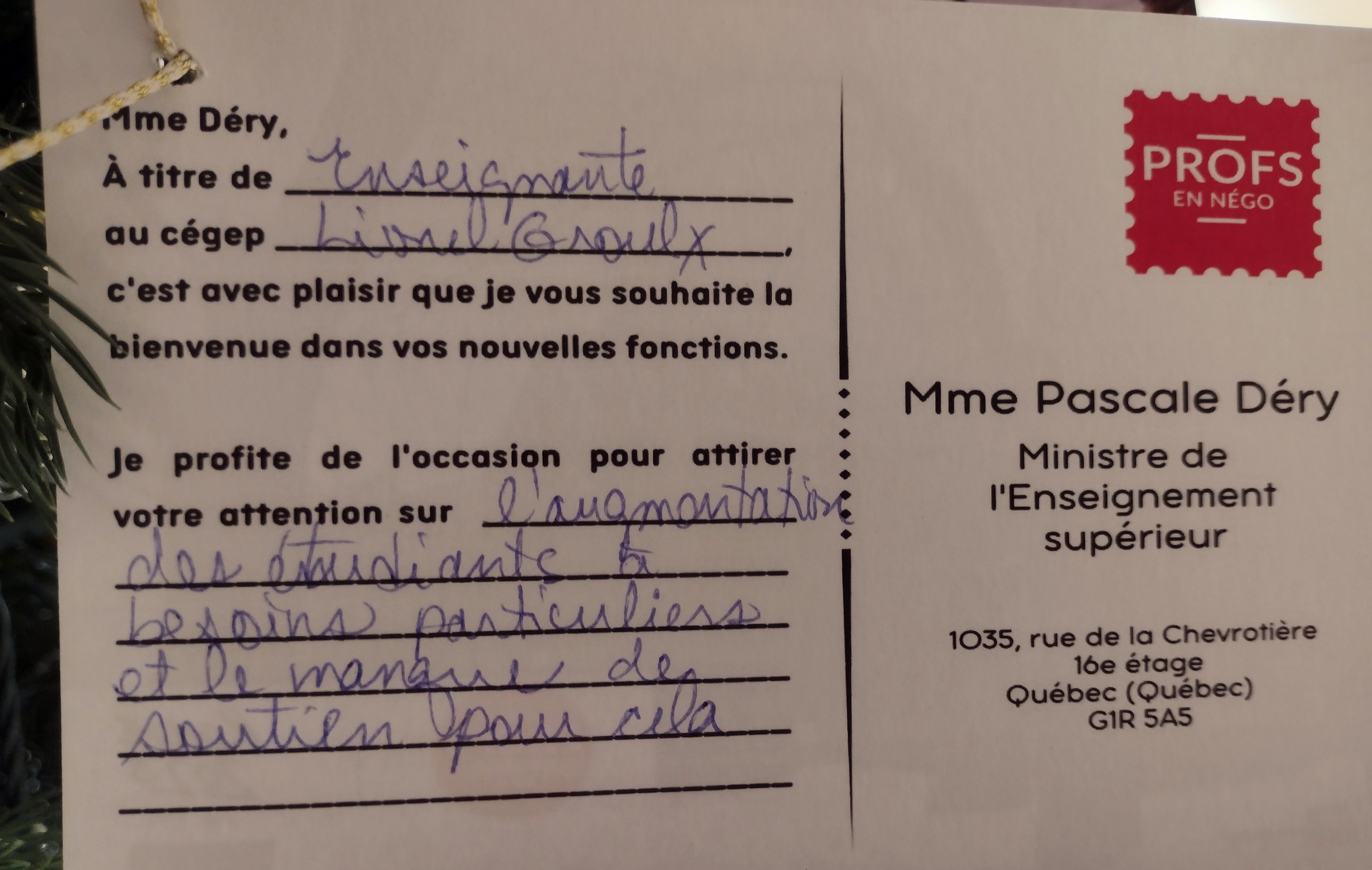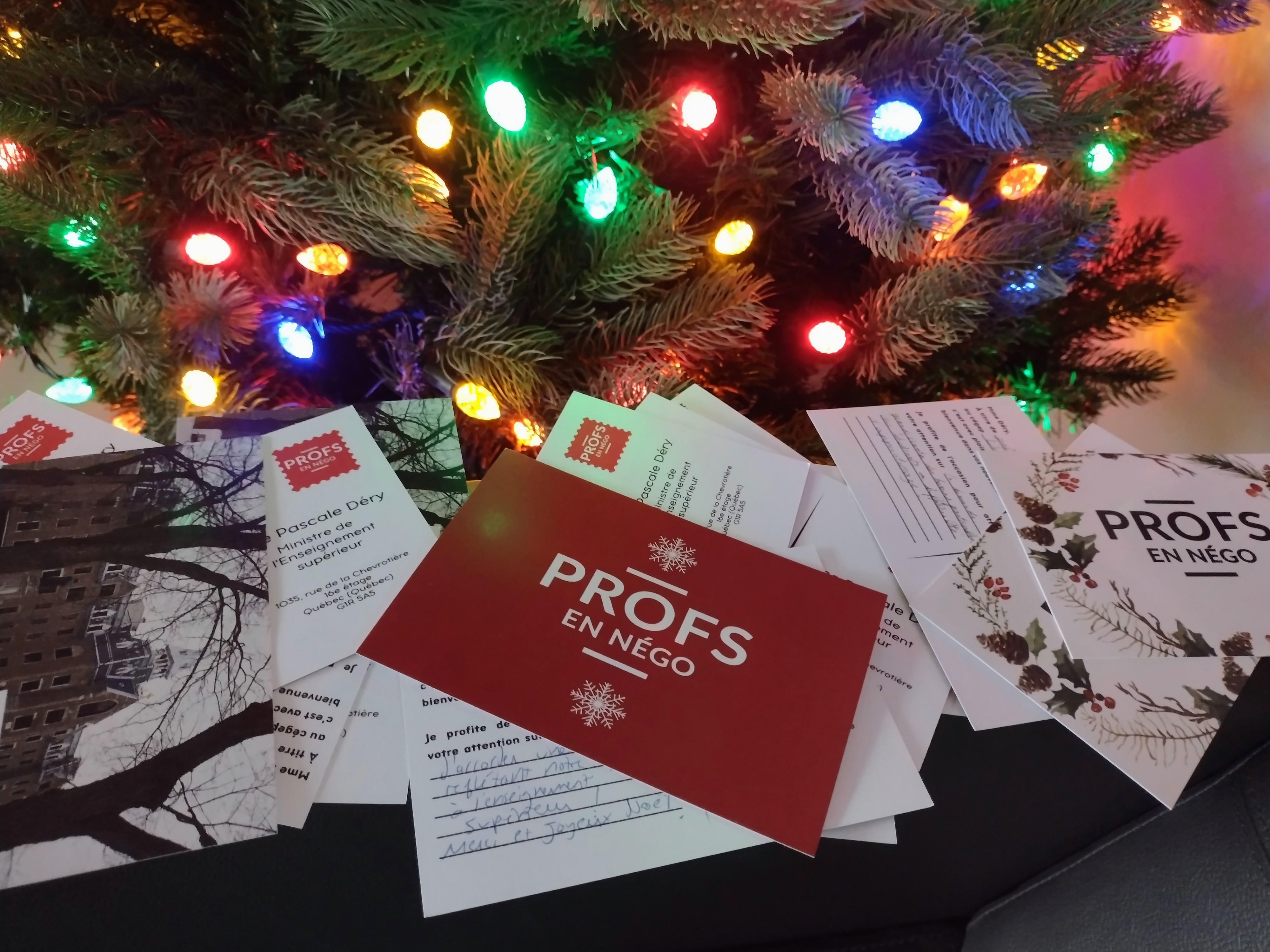 Sapin syndical ambulant, décoré de nos cartes postales à la nouvelle Ministre: les souhaits des profs adressés à notre Mère-Noël Pascale Déry