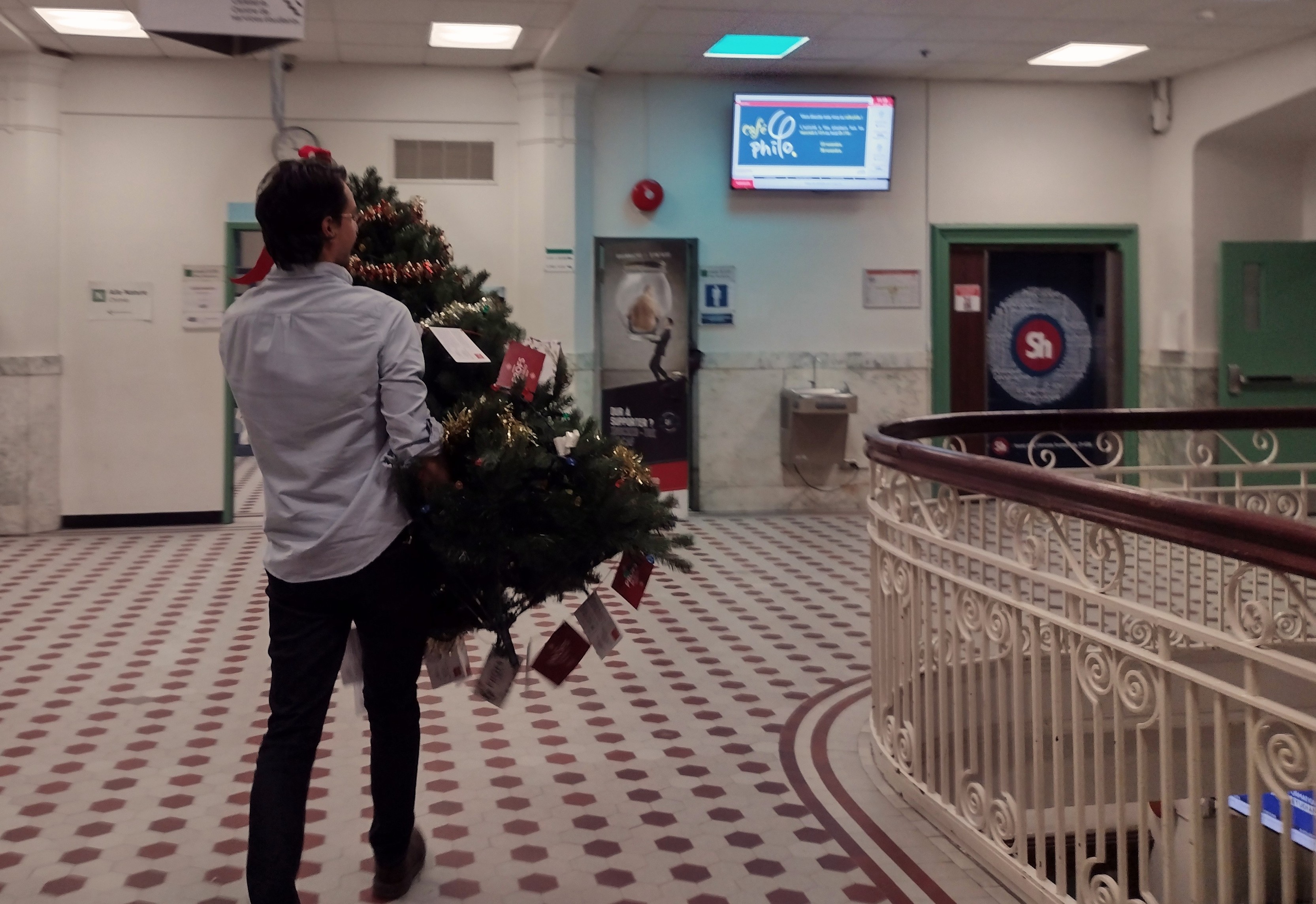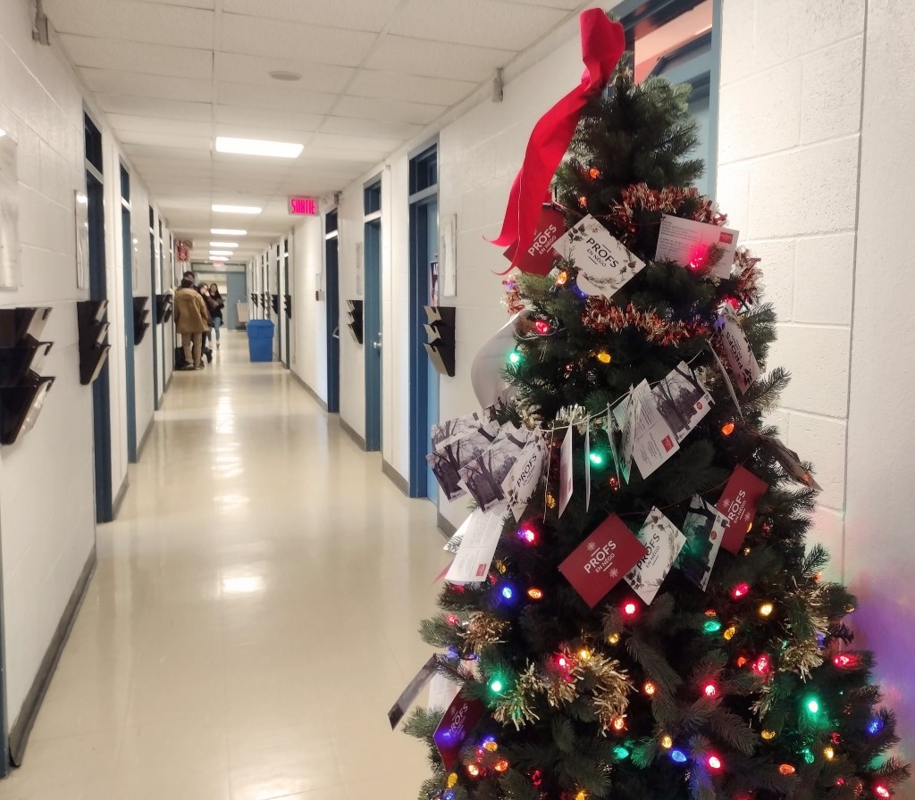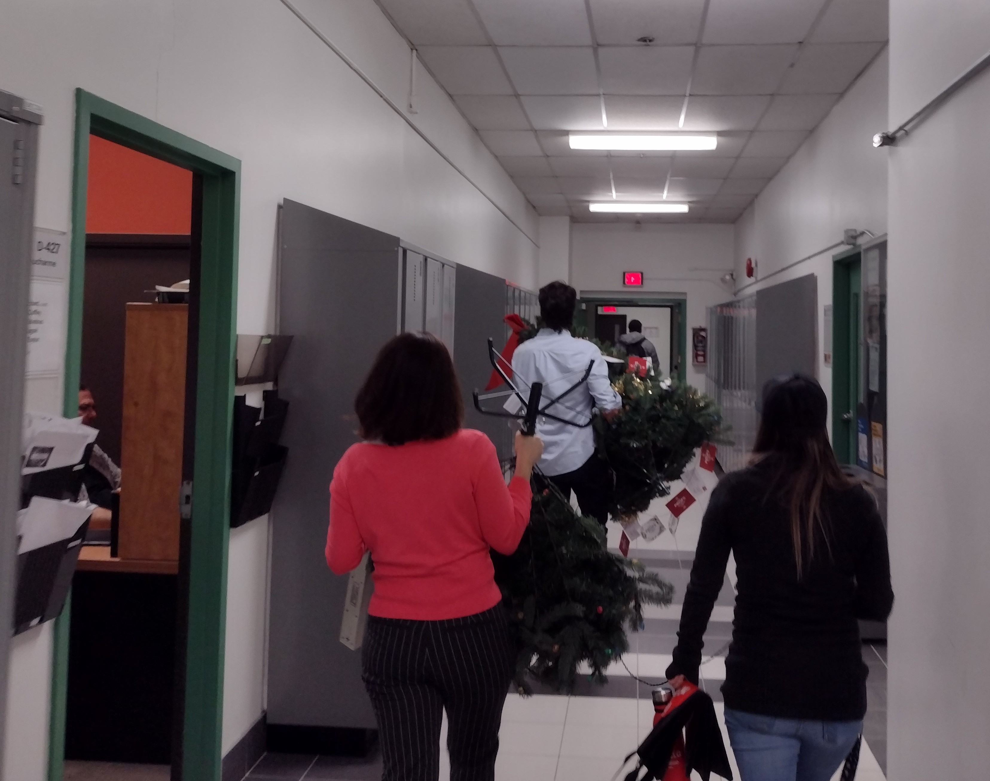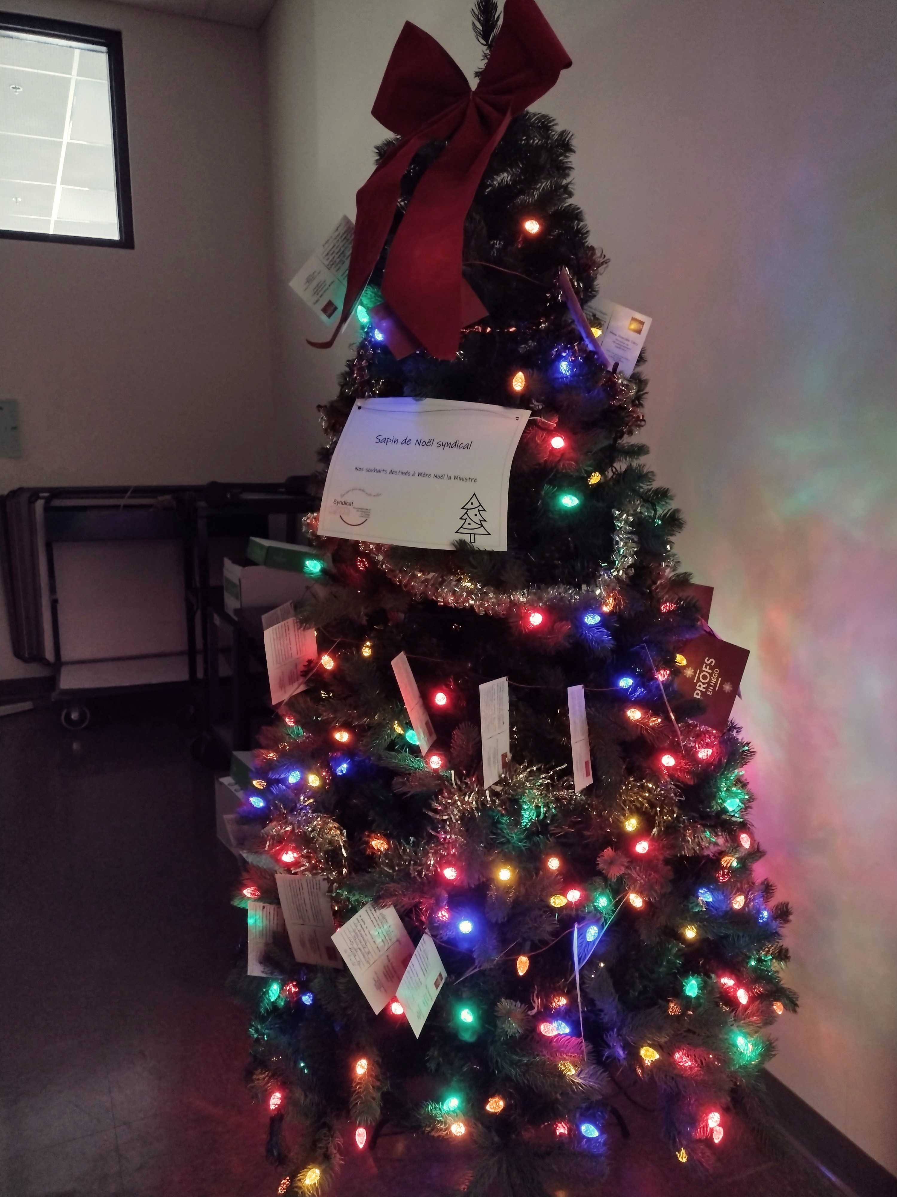 Sapin syndical ambulant, décoré de nos cartes postales à la nouvelle Ministre: les souhaits des profs adressés à notre Mère-Noël Pascale Déry