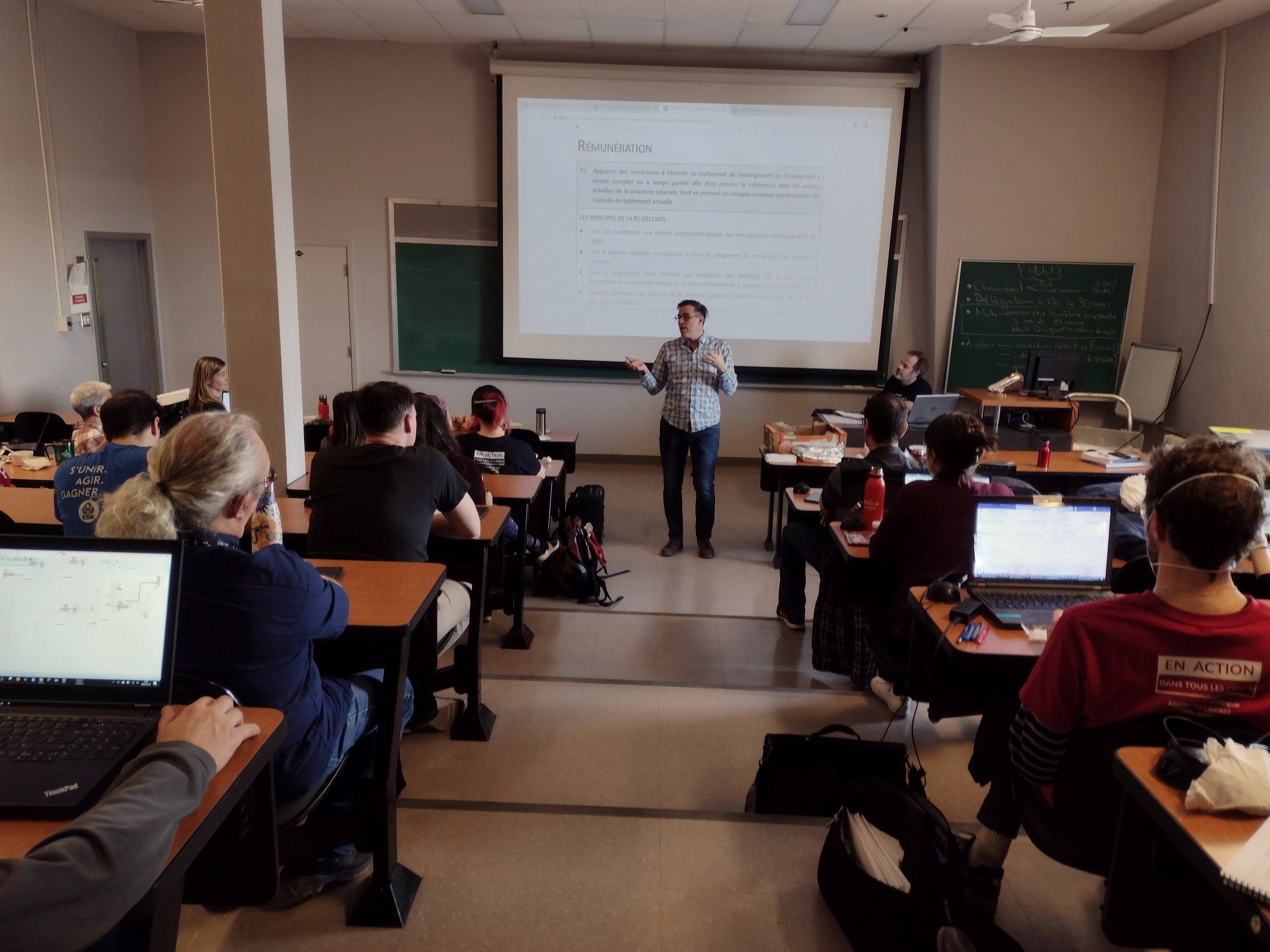 Il a rappelé que les membres de l’Association étudiante ont voté 2 jours de grève les 20 et 21 avril prochains, et qu’il faudra attendre le matin même pour constater s’il y a piquetage et si les cours seront levés.