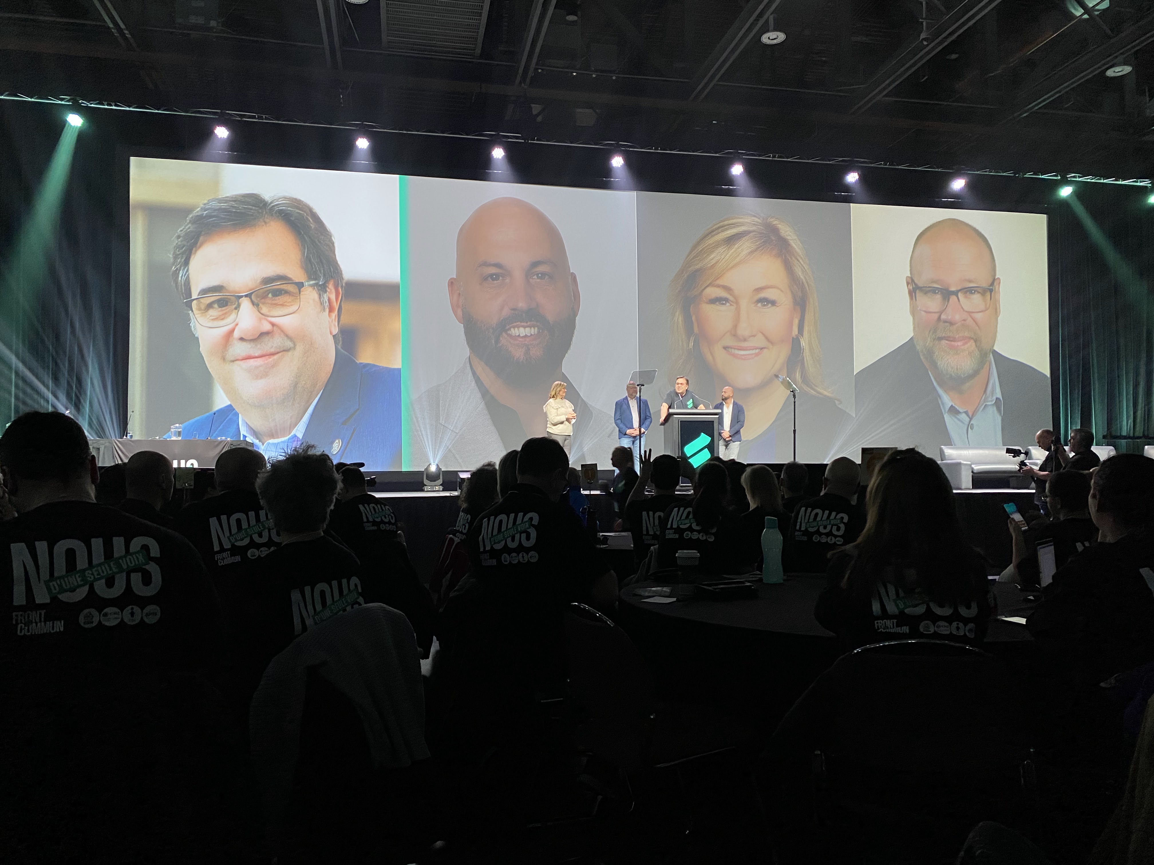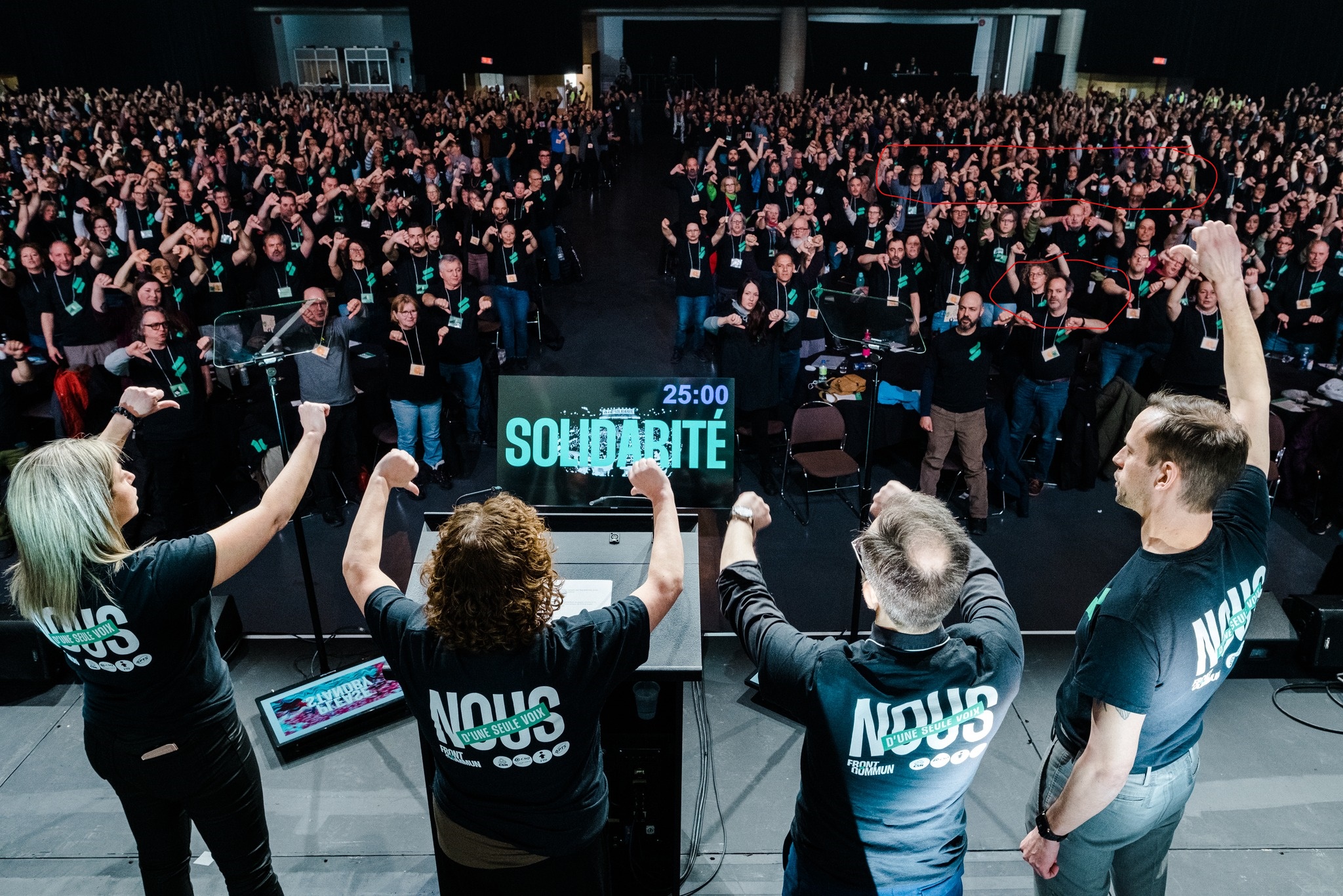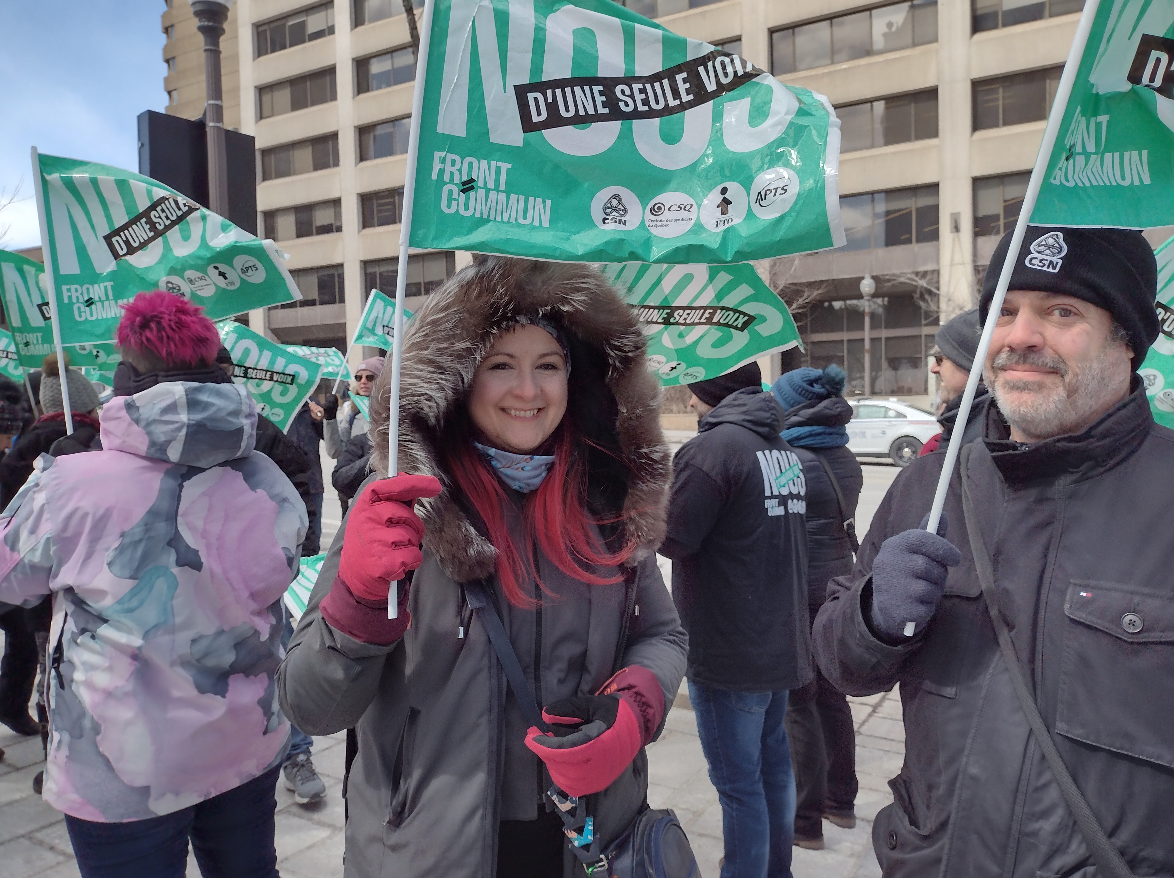 Au fil du temps, après les discours de mobilisation des quatre dirigeants du Front commun (CSN, CSQ, FTQ et APTS), on entend une série de témoignages personnels reliés aux revendications de la table centrale : une nutritionniste issue du milieu hospitalier dénonce l’épuisement du personnel, une préposée aux bénéficiaires partage ses émouvantes difficultés à boucler son budget à la fin de chaque mois, une secrétaire d’école primaire partage son rêve de pouvoir entamer sa retraite et enfin prendre soin d’elle après ses 35 ans de service, un employé du collégial déplore le départ de tous ses collègues qui trouvent ailleurs un meilleur salaire, une enseignante dénonce le fait que les profs n’ont pas accès à certaines flexibilités pourtant garanties par le Régime québécois d’assurance parentale (RQAP). On enchaine avec une discussion incroyable sur la mobilisation des travailleurs de l’éducation en Ontario où ça a brassé récemment.