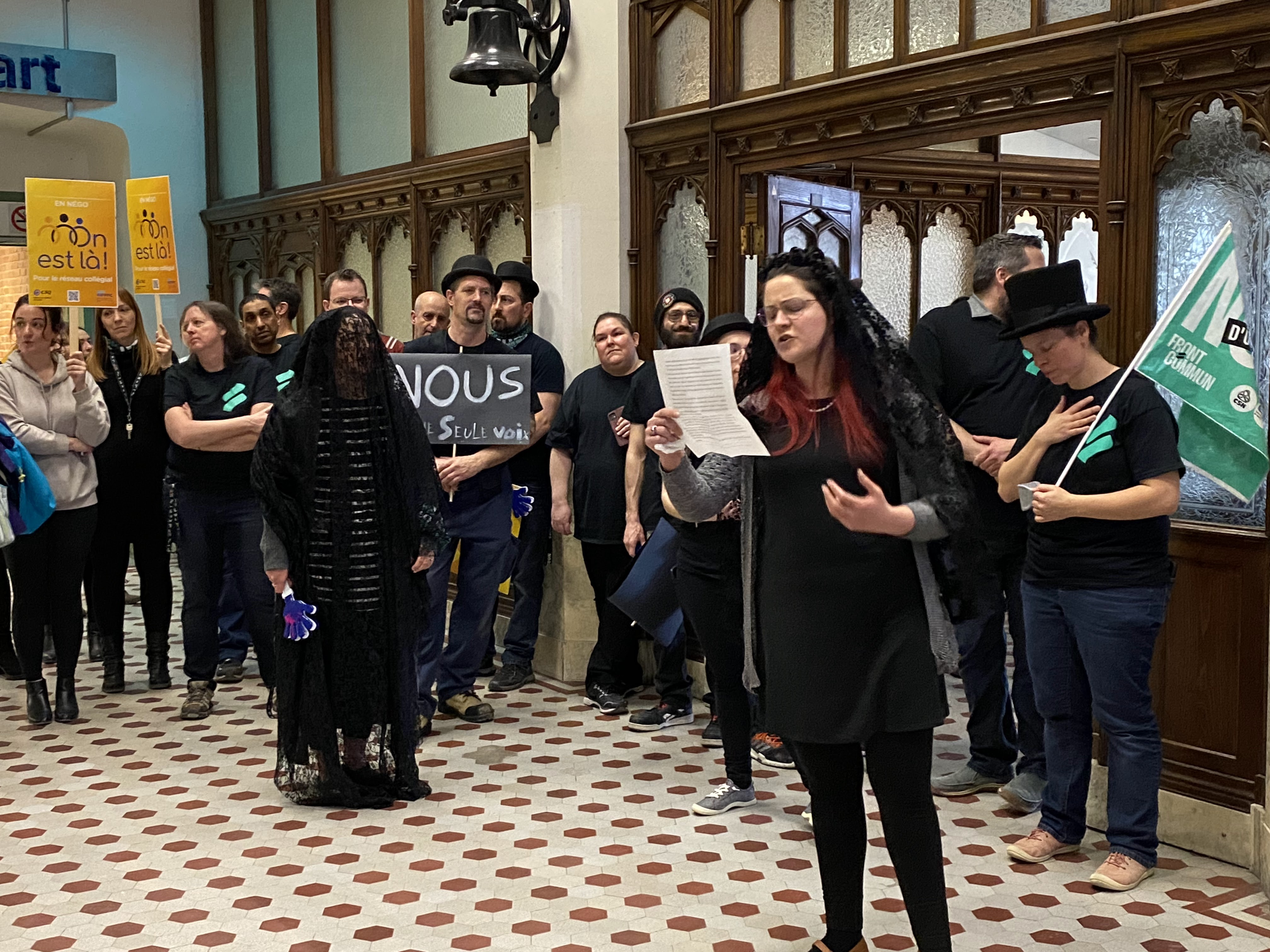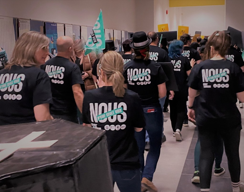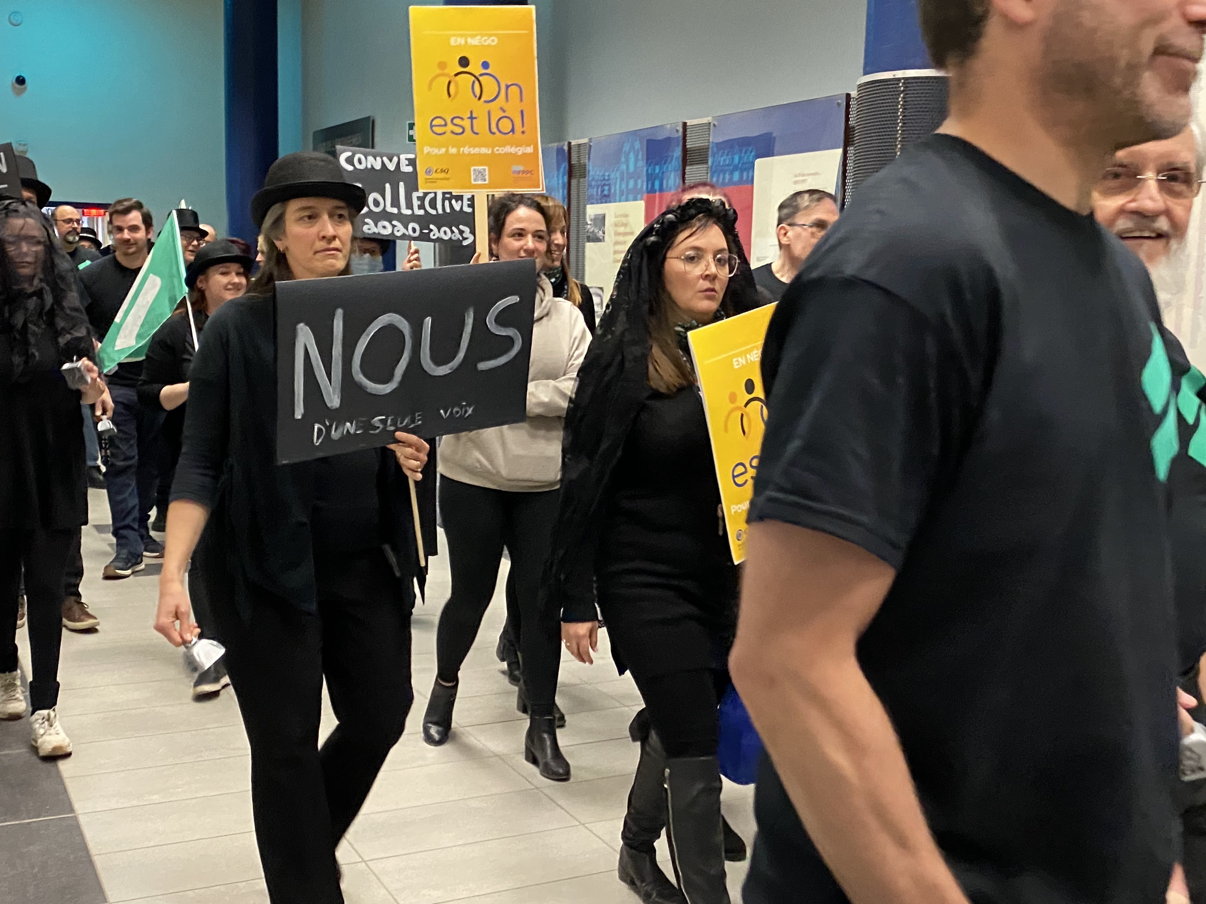 Vendredi 31 mars, le comité intersyndical de mobilisation a organisé une marche funèbre pour porter le deuil de notre convention collective. Habillés de noir, ce sont plus de 70 personnes qui ont défilé à travers tout le Collège. Cette marche bruyante a fait du bruit, a fait jasé et a surtout montré que les travailleuses et les travailleurs des trois syndicats de Lionel-Groulx sont solidairement motivés à faire avancer la négo pour créer un meilleur milieu de travail. Merci infiniment à toutes les personnes participantes (et un merci spécial à la TTP du costumier qui nous a fourni les accessoires funéraires, à Marie-Noëlle Aubertin pour son discours, de même qu’au président du Syndicat du personnel de soutien qui a gratté sa guitare et chanté durant 45 minutes!)!
