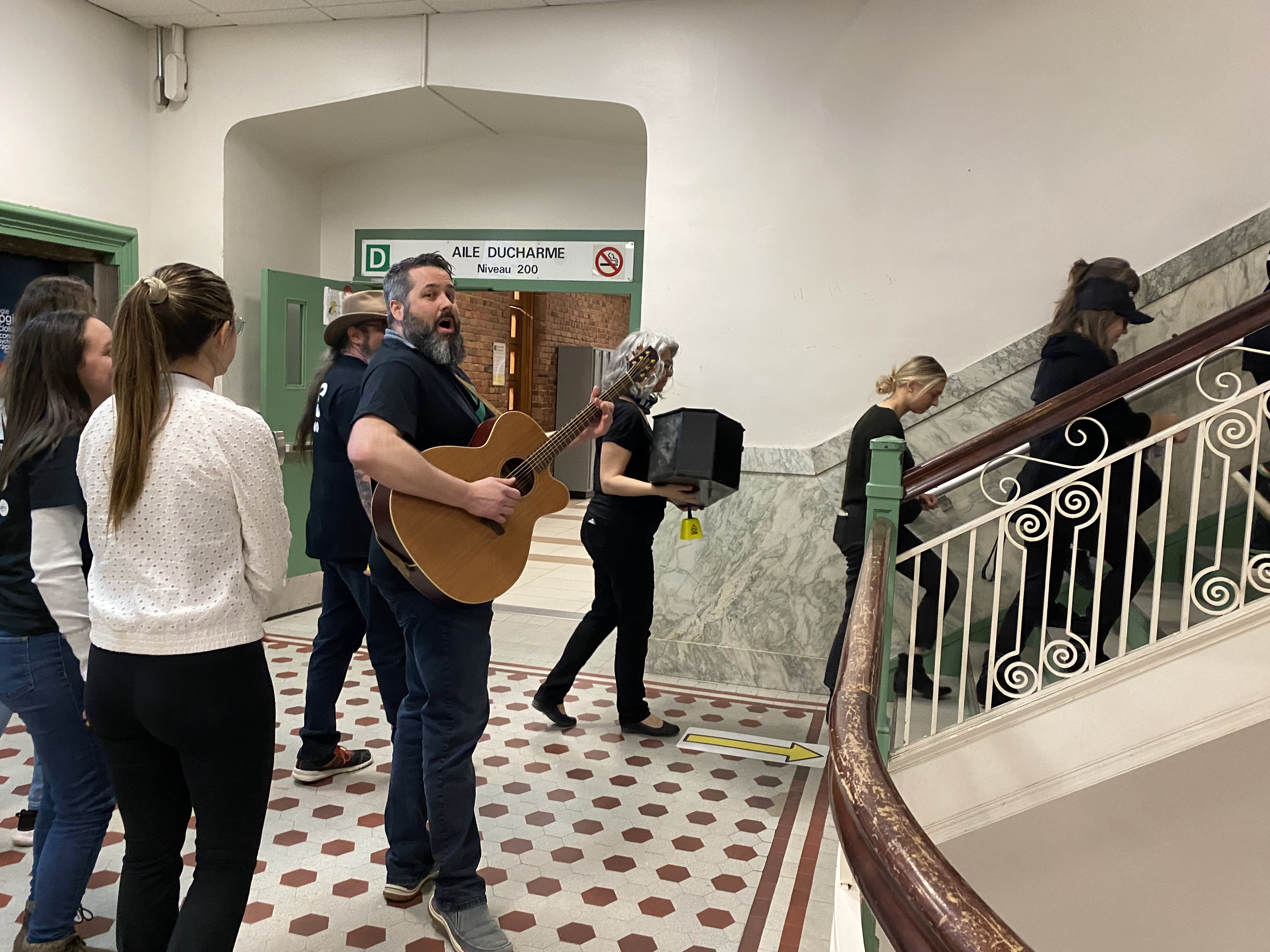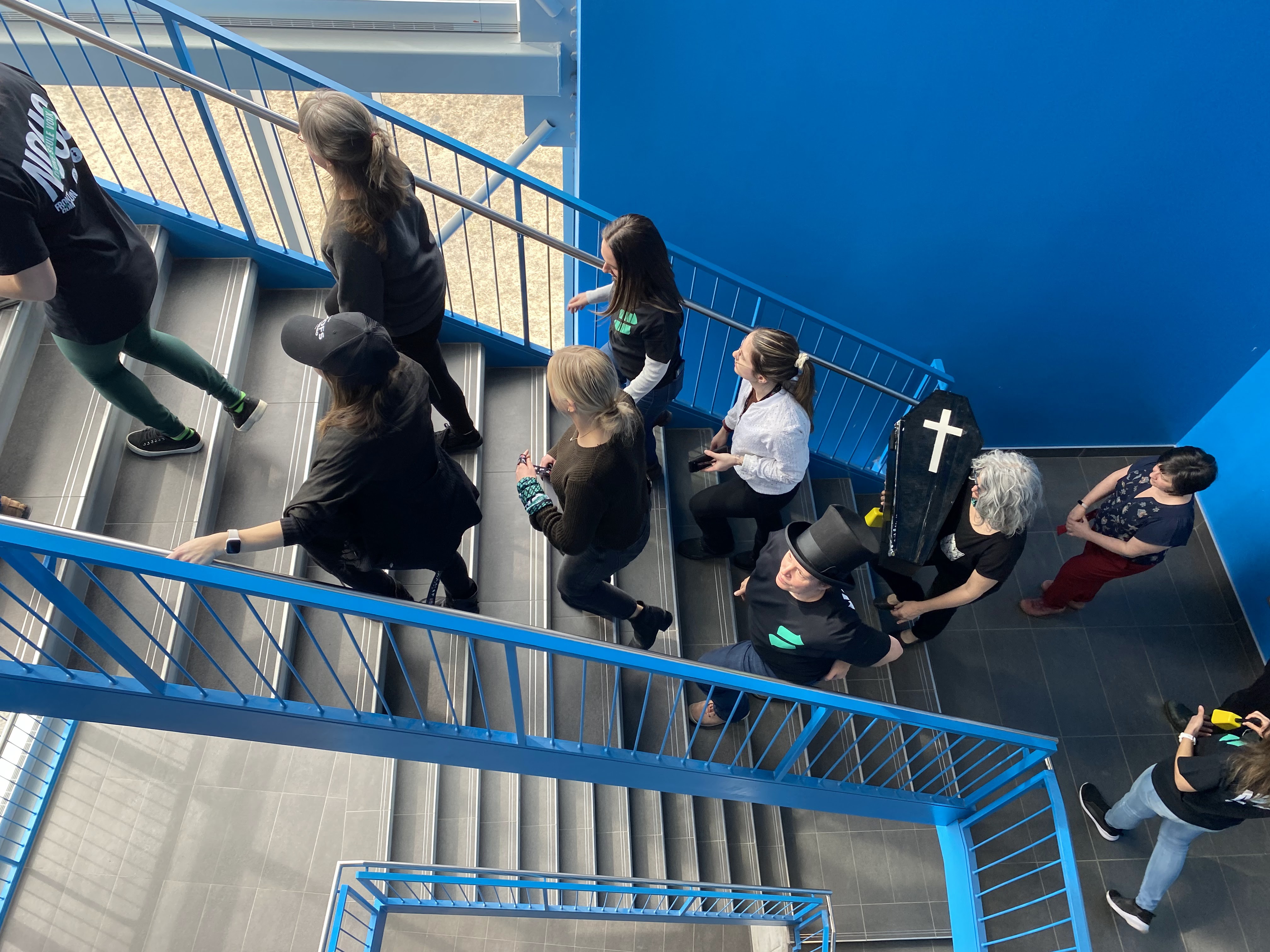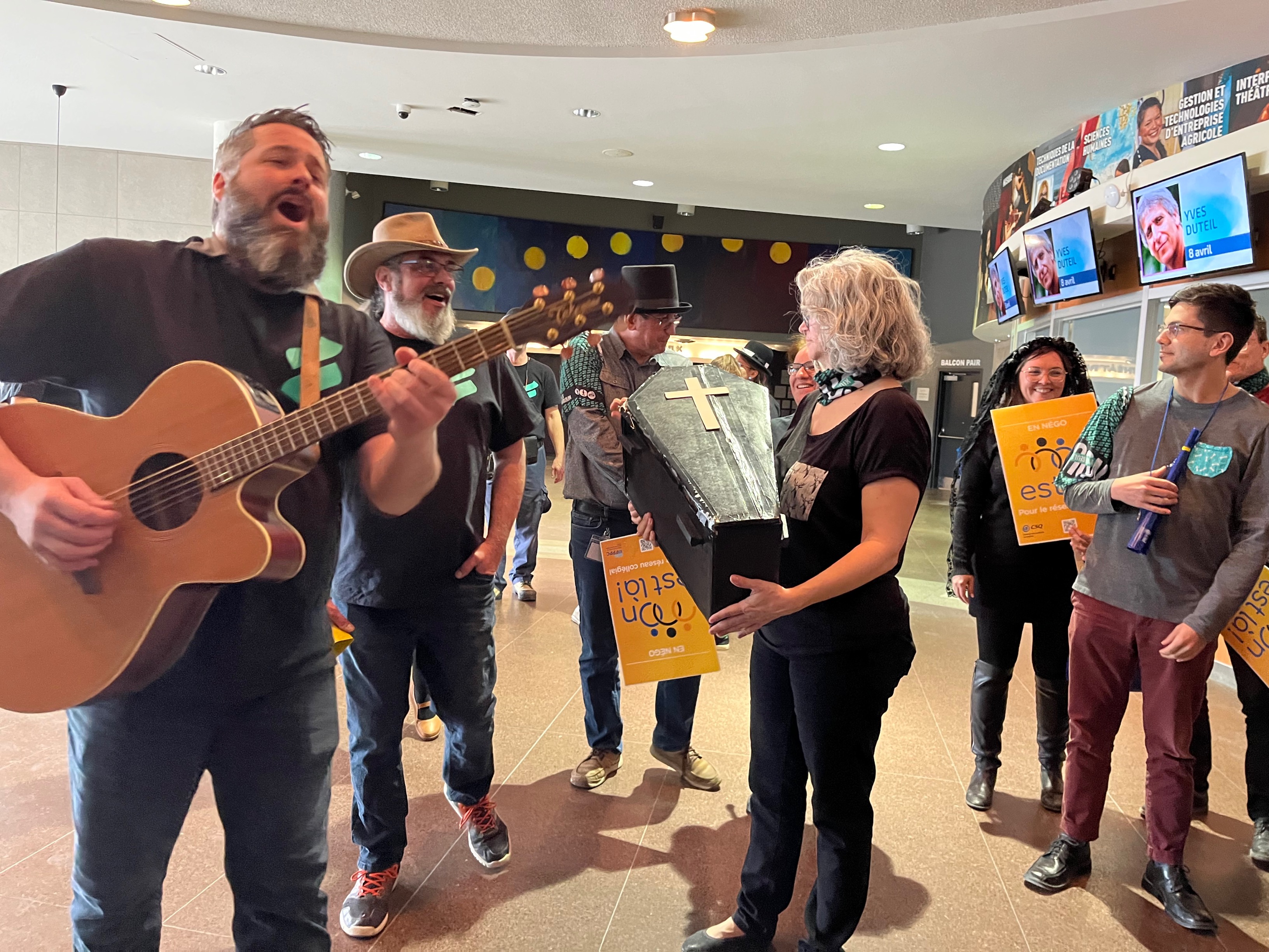 Vendredi 31 mars, le comité intersyndical de mobilisation a organisé une marche funèbre pour porter le deuil de notre convention collective. Habillés de noir, ce sont plus de 70 personnes qui ont défilé à travers tout le Collège. Cette marche bruyante a fait du bruit, a fait jasé et a surtout montré que les travailleuses et les travailleurs des trois syndicats de Lionel-Groulx sont solidairement motivés à faire avancer la négo pour créer un meilleur milieu de travail. Merci infiniment à toutes les personnes participantes (et un merci spécial à la TTP du costumier qui nous a fourni les accessoires funéraires, à Marie-Noëlle Aubertin pour son discours, de même qu’au président du Syndicat du personnel de soutien qui a gratté sa guitare et chanté durant 45 minutes!)!