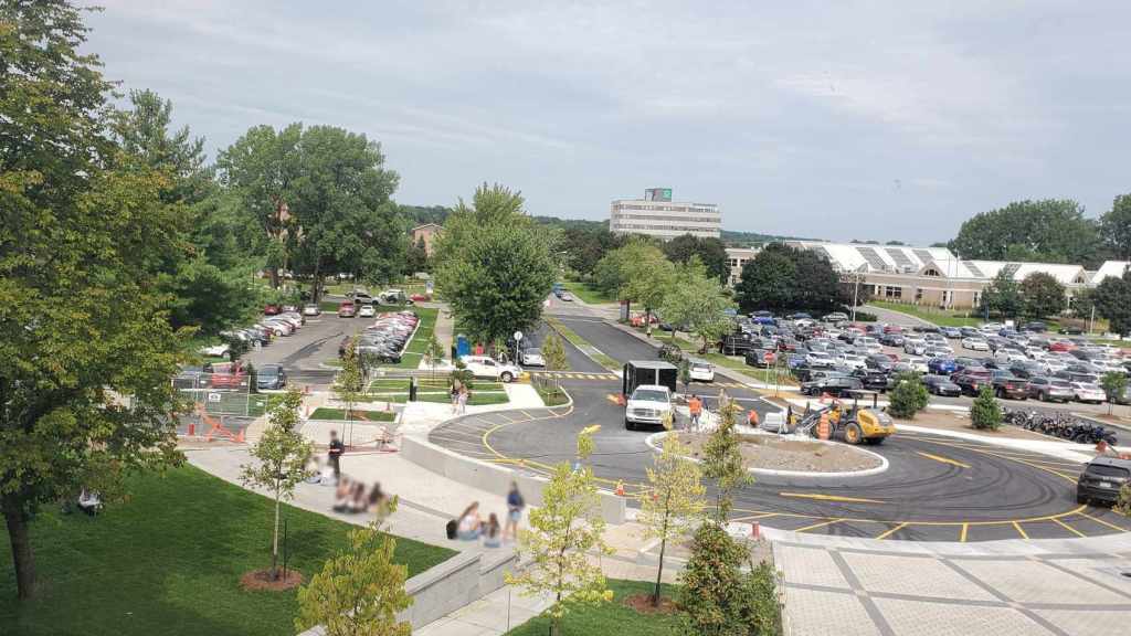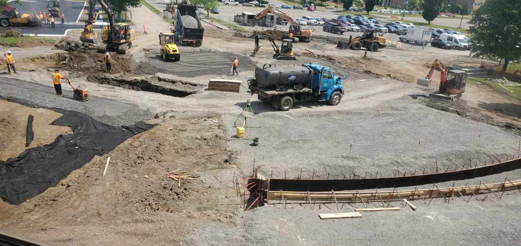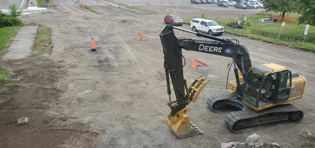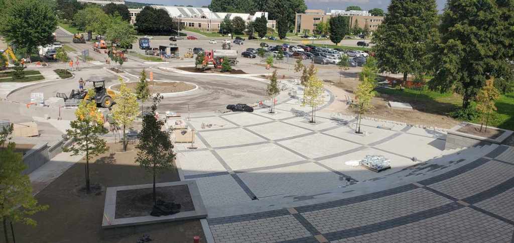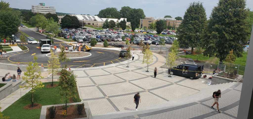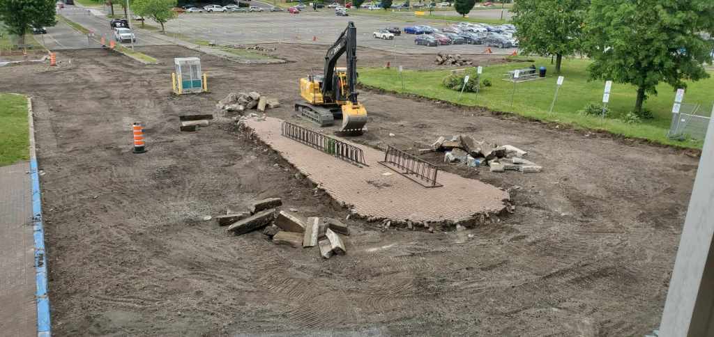 Difficile de ne pas remarquer la nouvelle entrée principale de notre Collège, n’est-ce pas? C’est-tu pas assez beau? Bel ouvrage! Il faut le reconnaitre. Quasiment terminé avant le début des cours! Du rarement vu! Les pénalités de retard pour les entrepreneurs devaient être salées. Ça bourdonnait à la veille de la rentrée, je vous assure. Nous avions une place au premier rang : le local syndical étant bien situé pour surveiller l’entrée (voir photos ci-bas prises de juin à septembre, merci Claudia!). J’adore jaser de tout et de rien, en chair et en os, sur notre nouveau perron d’église. Ça fait du bien! « On aurait pu utiliser l’argent pour climatiser les classes, acheter des photocopieurs », m’a-t-on dit. « Tu sais, ce sont sûrement des enveloppes budgétaires distinctes », me suis-je entendu répondre.