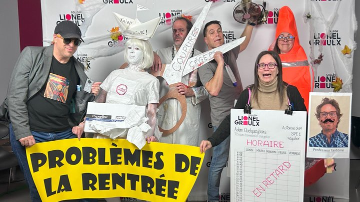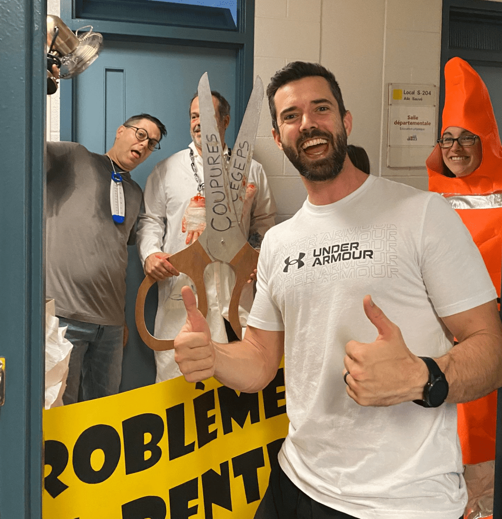 Voici le mois de novembre1. N’oubliez pas de reculer l’heure en fin de semaine! C’est peut-être la dernière fois que nous vivrons collectivement ce beau moment. Souffrez-vous de dépression saisonnière? Moi oui! Je vous le confesse… Comme une espèce de lassitude, une diffuse sensation de « bof moé tsé » (merci Marilyn pour le t-shirt!) surtout provoquée par les récentes nouvelles en éducation comme les coupures budgétaires et le gel des embauches. C’est pour souligner ces insensées coupures dans nos écoles et ses effets sur nous tous, sur notre quotidien et notre motivation que nous avons choisi ce thème de déguisement pour l’Halloween. C’est le retour du mot en A2, même si on ne veut pas le nommer, qui nous affecte directement. En pleine période de croissance, on coupe à grands coups de hache ensanglantée dans les budgets et les services. C’est tout à fait logique. C’est la qualité des cours qui en souffre, c’est le milieu de vie qui se dégrade, c’est les emplois des collègues qui sont compromis. Difficile de ne pas y voir une basse stratégie électorale aux effets délétères. Checkez ben les milliards s’allonger la veille des prochaines élections!