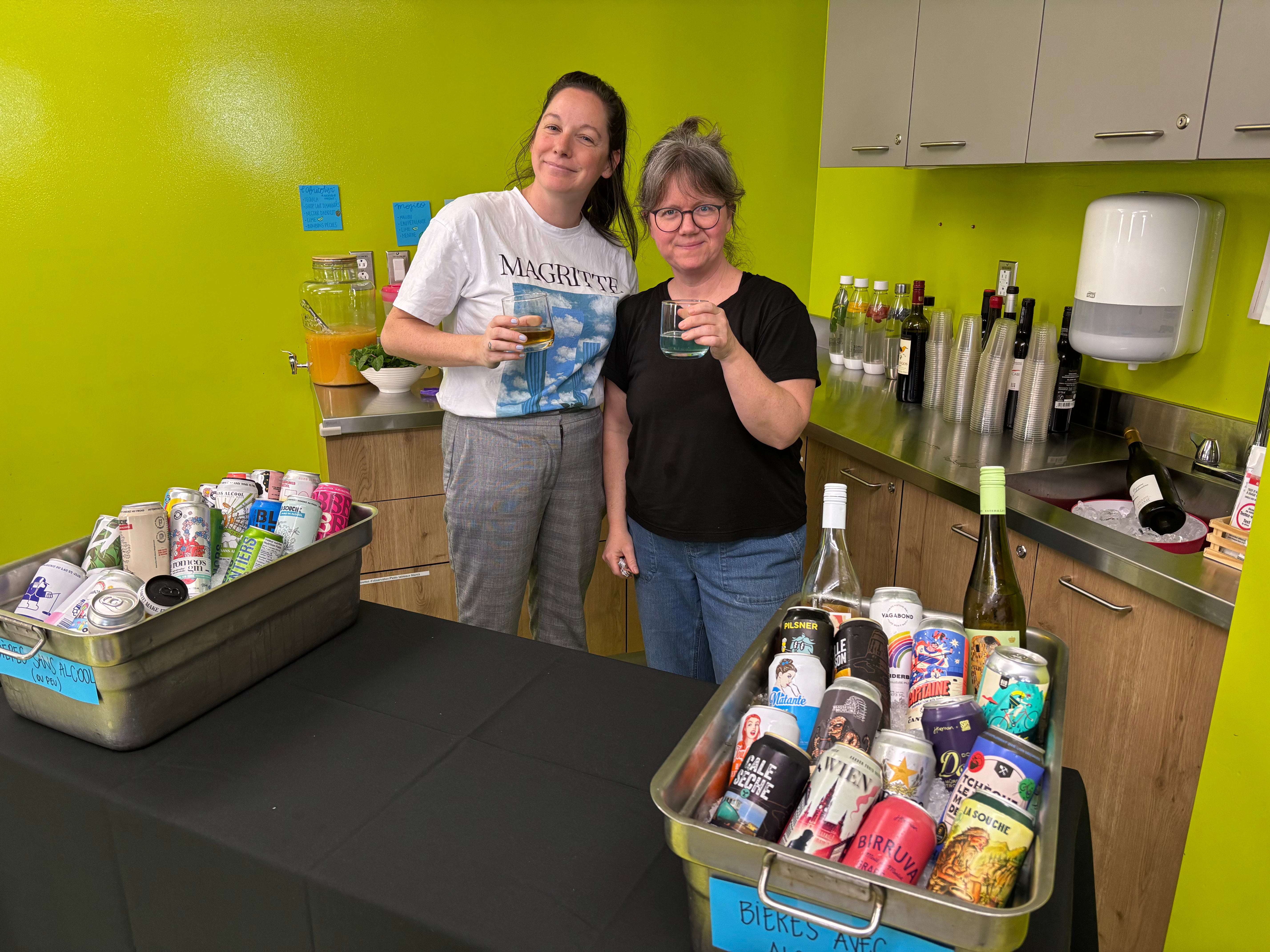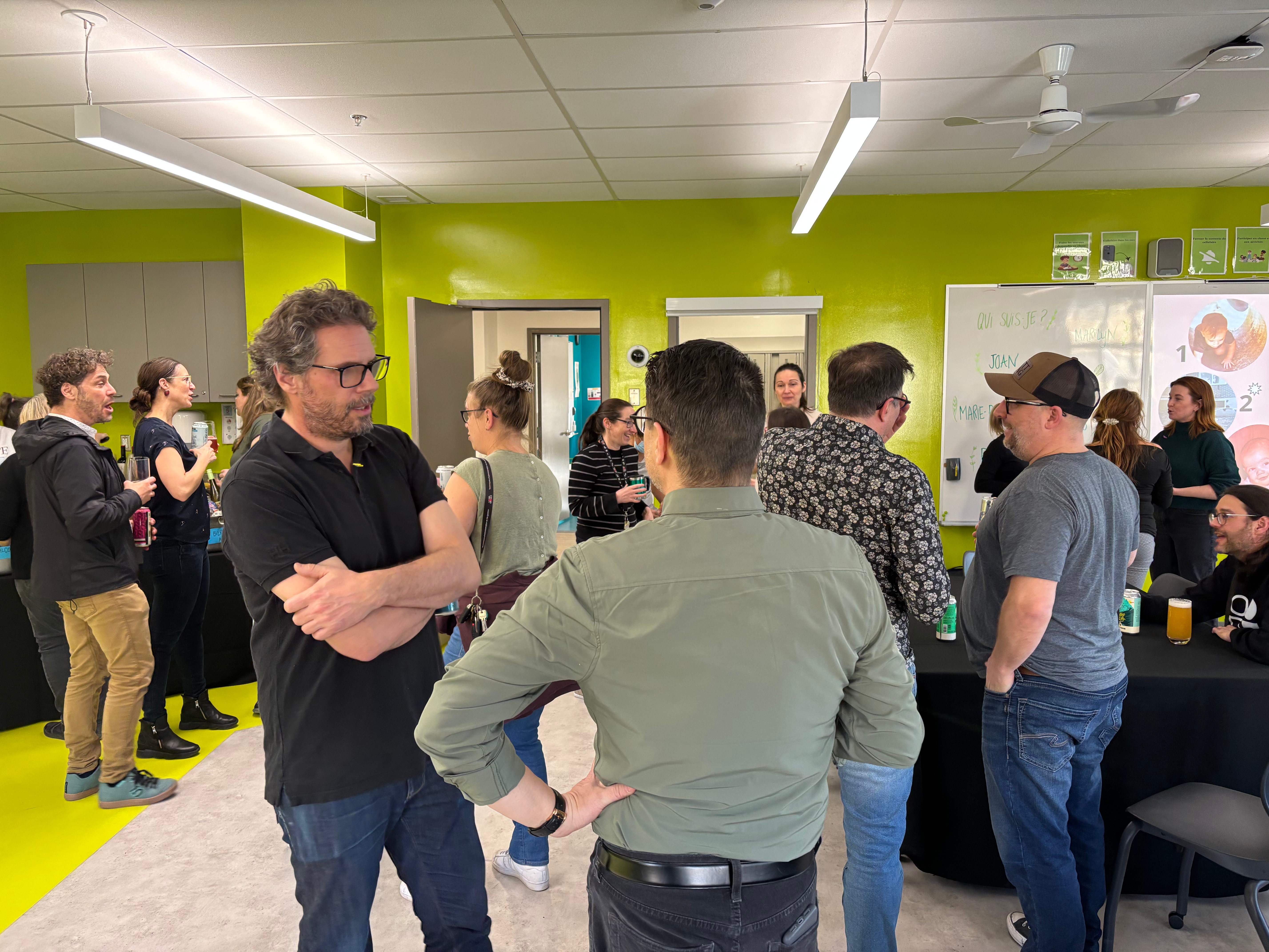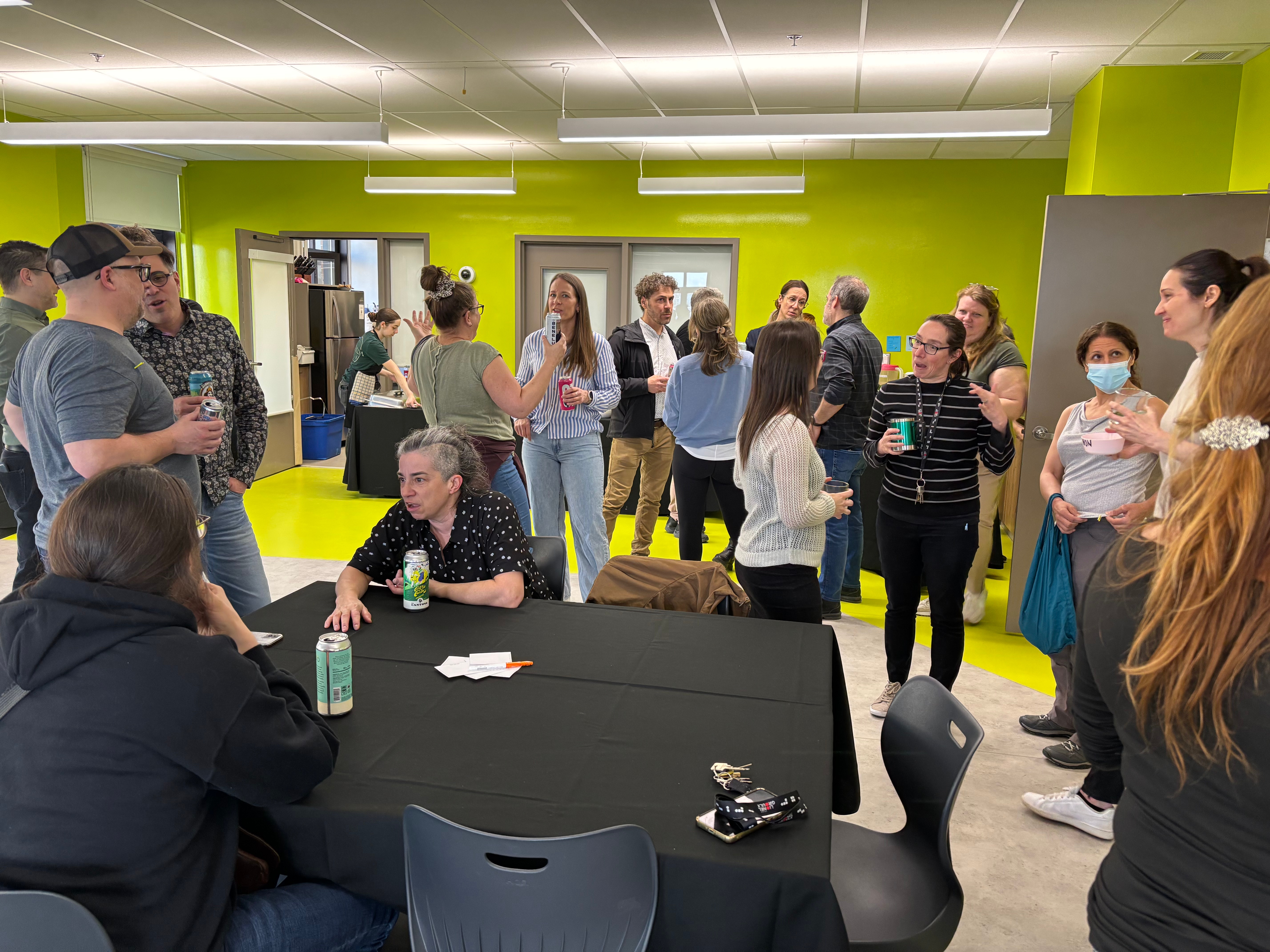 Après un report forcé par des conditions météorologiques difficiles, le 5@7 du département de Techniques d’éducation à l’enfance, organisé conjointement avec le Comité social du SEECLG, a enfin pu avoir lieu le 3 avril dernier. Quelle soirée agréable! Les convives ont été accueillis de manière chaleureuse et fort sympathique par l’équipe de ce département. On nous a offert l’apéro, ainsi qu’un bon repas préparé par le traiteur Mathilda café Montmartre de Saint-Jérôme, mais surtout, c’était l’occasion de rencontrer des collègues de différentes disciplines, d’échanger ensemble et de passer un très beau moment. Nos collègues en TÉE ont présenté et fait visiter le joyau de leur programme : une matériathèque bien garnie de jouets et de livres pour enfants à l’usage de leur communauté étudiante, et ils avaient préparé un petit jeu lors duquel il fallait identifier, parmi des photos mystères de bébés… les membres de l’exécutif! Conclusion? Il semblerait que Marilyn et Denis se ressemblent![1] Merci à tous les collègues qui se sont impliqués dans l’organisation de l’événement! Voici quelques photos souvenirs; sur la première, on voit Sandrine Beauchamp, enseignante en TÉE, et Roxanne de Tonnancourt, TTP en TÉE.